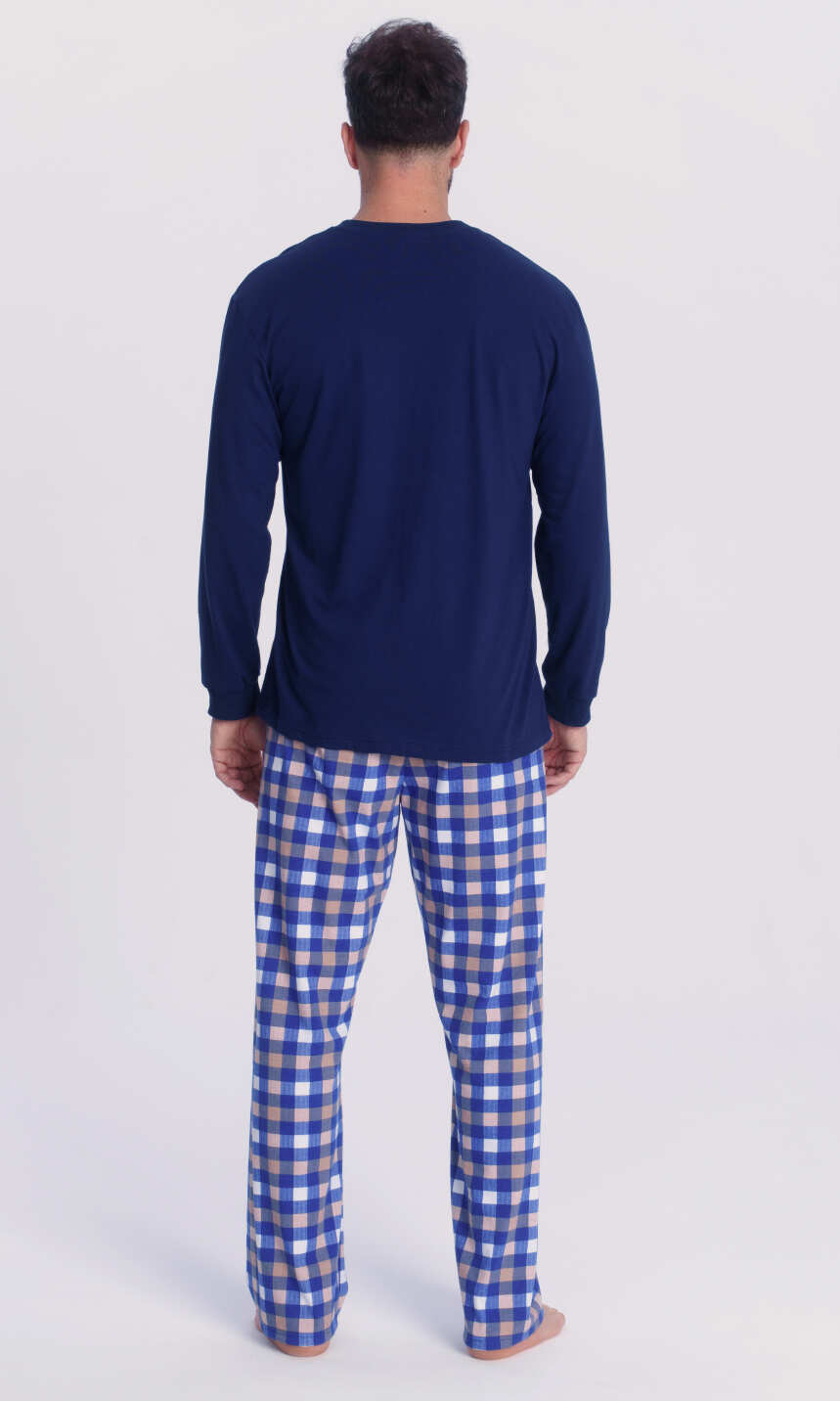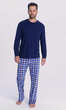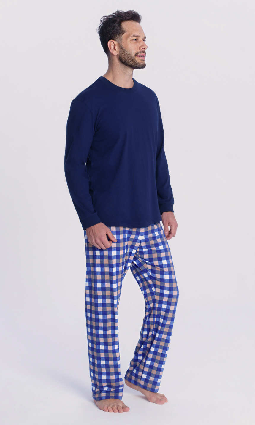 Bluza w kolorze atramentywym, gładka, bez nadruku. Półokrągły dekolt wykończony ściągaczową wypustką. Rękaw wszyty klasycznie, zakończony ściągaczowym mankietem. Spodnie w ładnie zestawioną kolorystycznie kratę. W pasie wciągnięta w tunel i przeszyta trzycentymetrowa guma. Nogawki proste, zakończone podwinięciem. Miła dla ciała, wygodna i praktyczna.