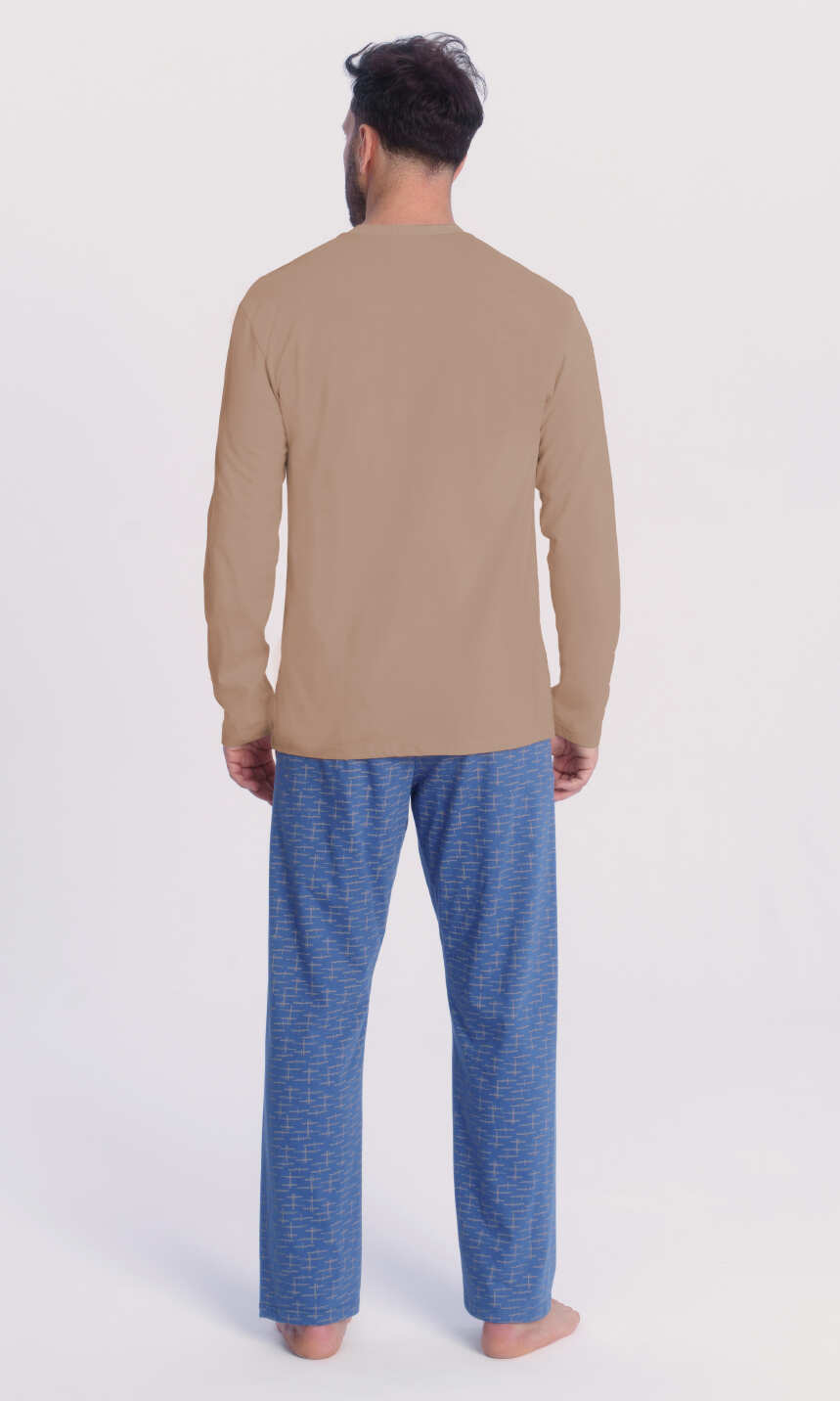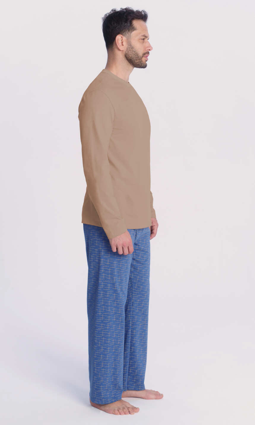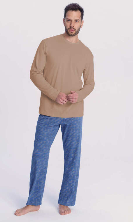 Bluza gładka, bez nadruku. Półokrągły dekolt wykończony ściągaczową wypustką. Rękaw wszyty klasycznie, z podkrojem, zakończony jak dół bluzy - podwinięciem. Spodnie z bardzo delikatnym, beżowym nadrukiem. W pasie wciągnięta w tunel i przeszyta trzycentymetrowa guma. Nogawki proste, zakończone podwinięciem. Miła dla ciała, estetyczna i wygodna w użytkowaniu.
