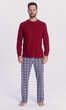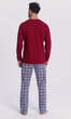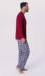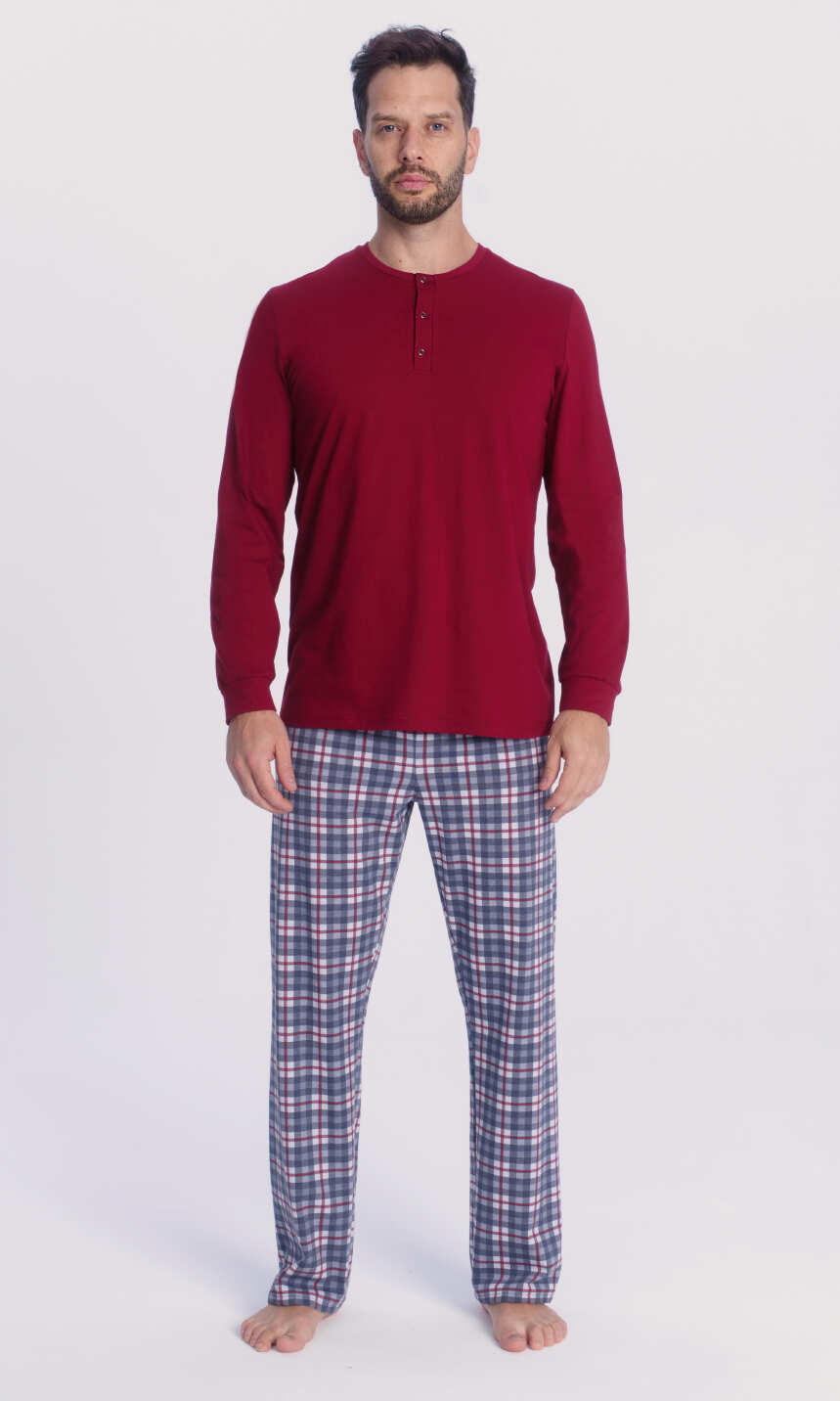 Bluza gładka,.zapinana pod szyją na trzy napy. Półokrągły dekolt wykończony bawełnianą, ściągaczową wypustką. Rękaw wszyty klasycznie, z podkrojem, zakończony ściągaczowym mankietem. Spodnie długie, w bardzo ładnie zestawioną kolorystycznie kratę, z wciągniętą i zaszytą w pasie trzycentymetrową gumą. Miła zarówno dla ciała jak i oka.