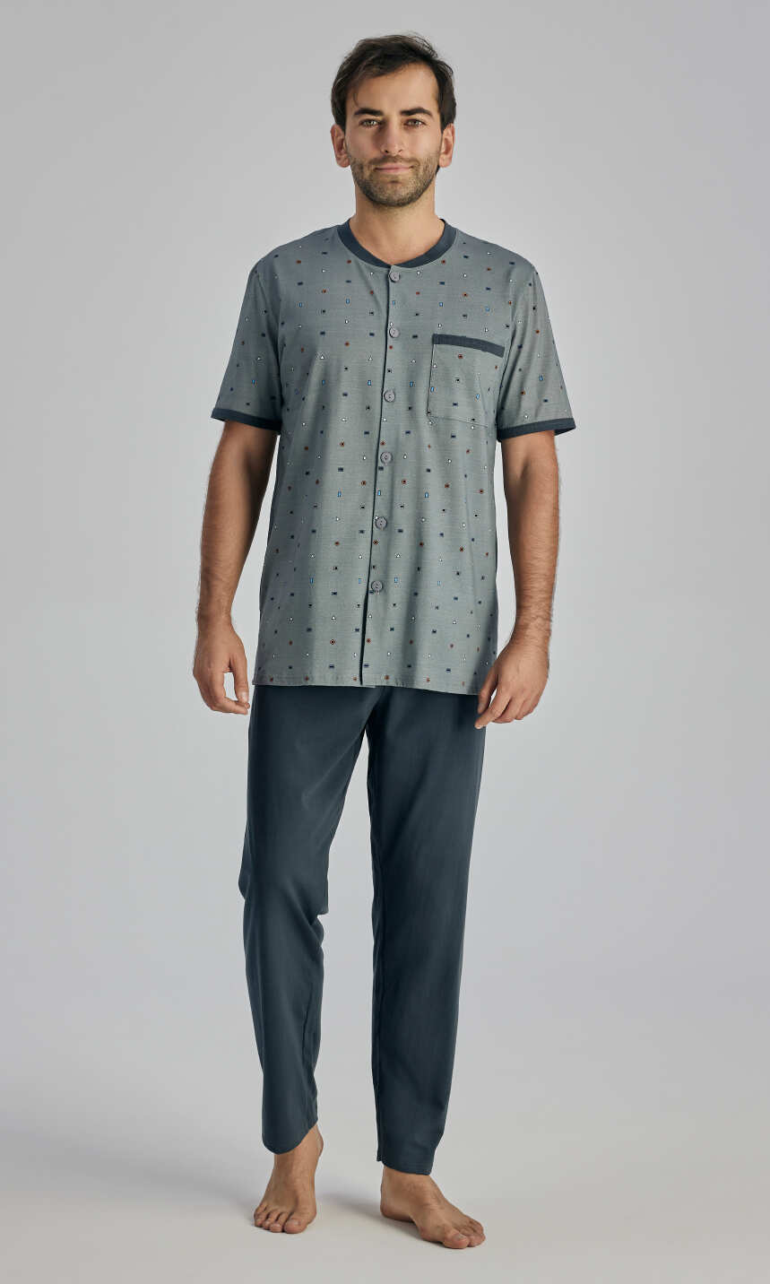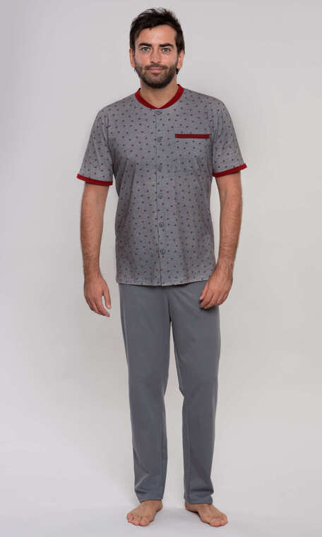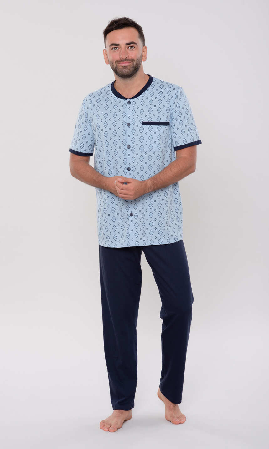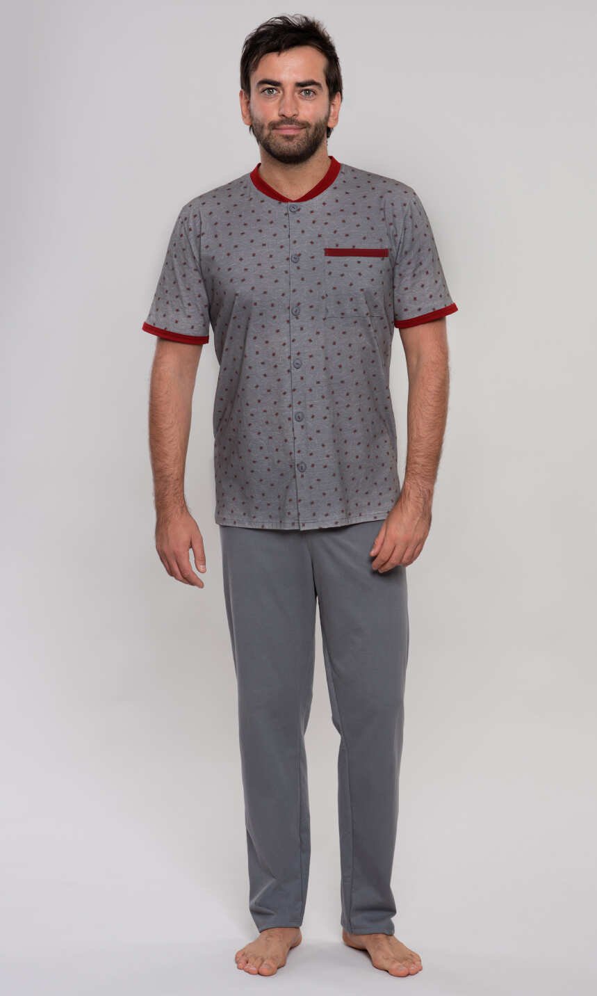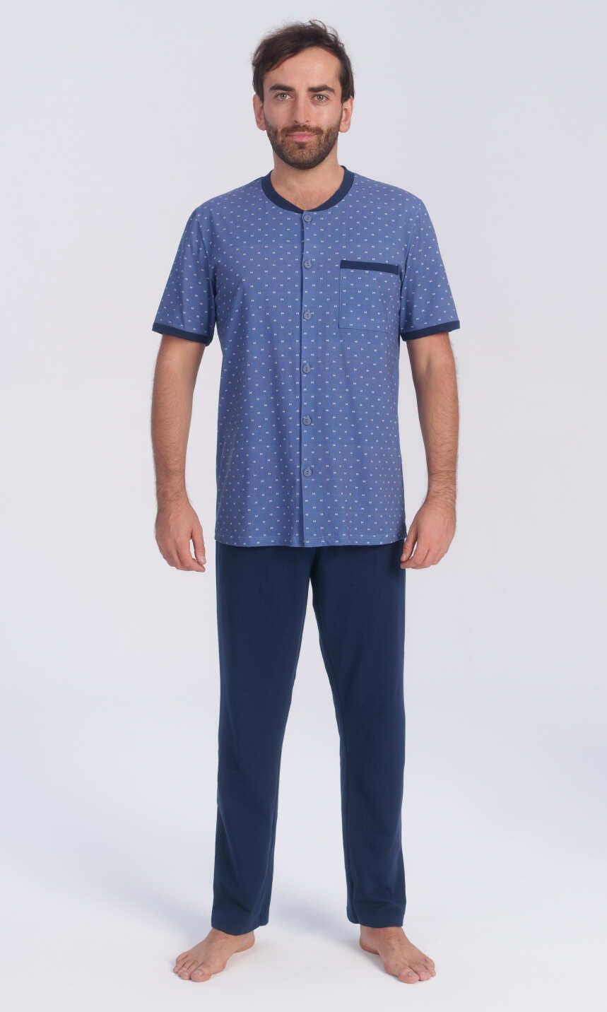 Bluza z delikatnym wzorem, rozpinana po całej długości. Po lewej stronie mała kieszonka. Półokrągły dekold, kieszonka i wszyte klasycznie rękawki wykończone kontrastową lamówką. Spodnie gładkie, długie, proste, z wciągniętą i zaszytą w pasie gumką. Wygodna, miła dla ciała i oka. Z bokserkami 20139 w odpowiednim kolorze lub slipami 20029 tworzą bardzo ładny komplet męskiej bielizny.