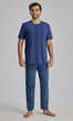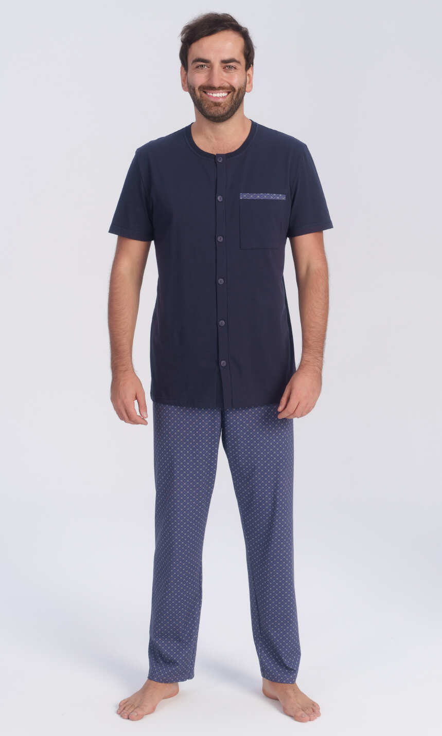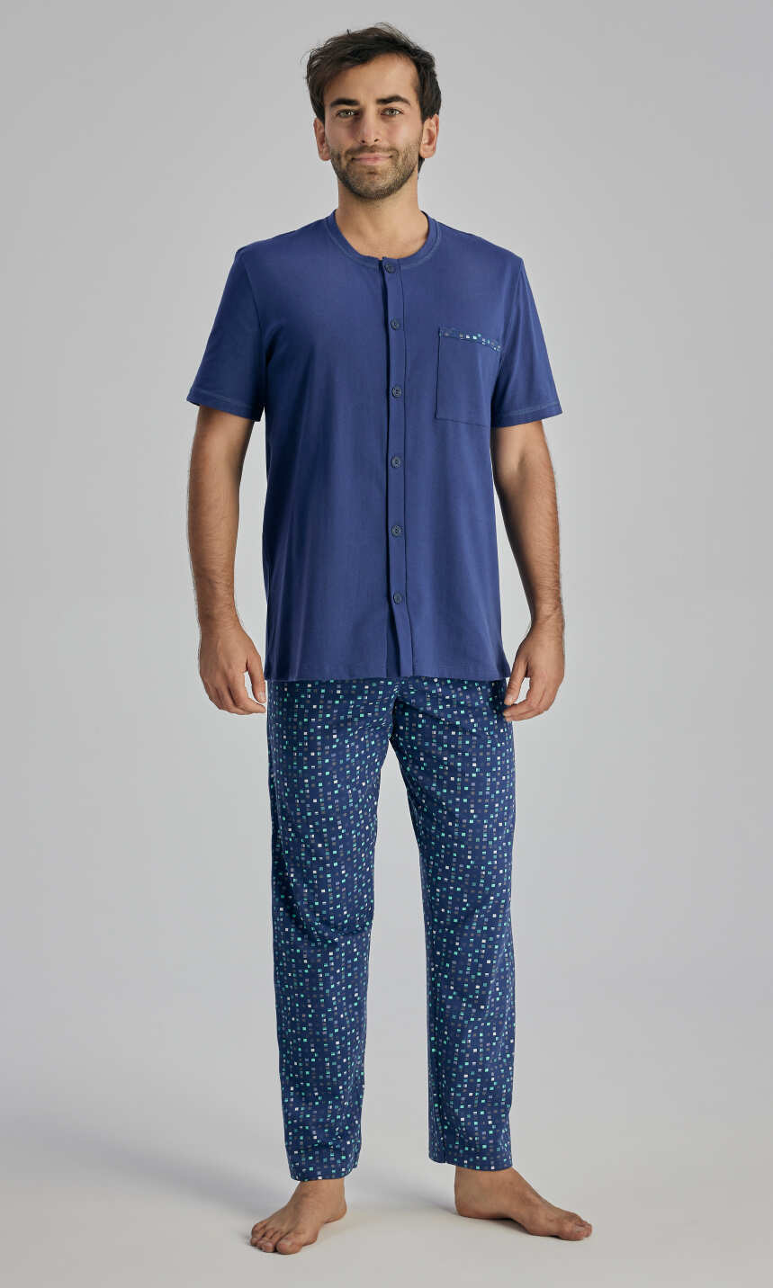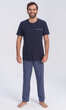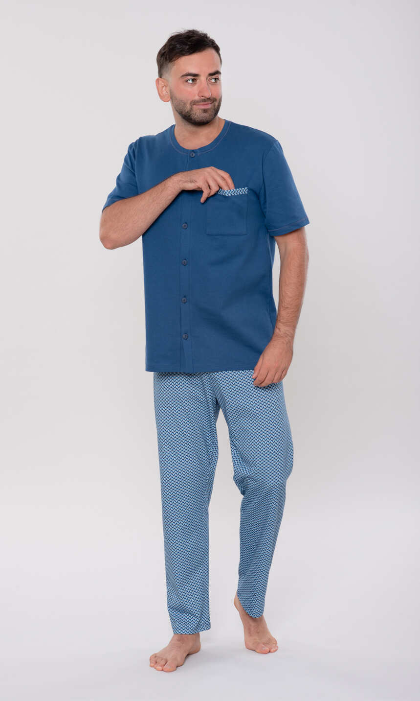 Bluza gładka, bez nadruku. Półokrągły dekolt wykończony szeroką, ściągaczową wypustką i ozdobiony dekoracyjnym przeszyciem. Rękaw wszyty klasycznie. Na przodzie z lewej strony, praktyczna, wykończona lamówką z nadrukiem kieszonka. Spodnie z nadrukiem, z wciągniętą i zaszytą w pasie gumką. Nogawki proste, zakończone podwinięciem. Praktyczny, zawsze cieszący się powodzeniem klasyk.