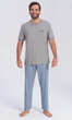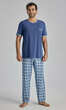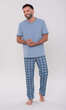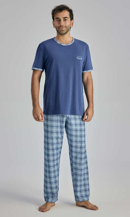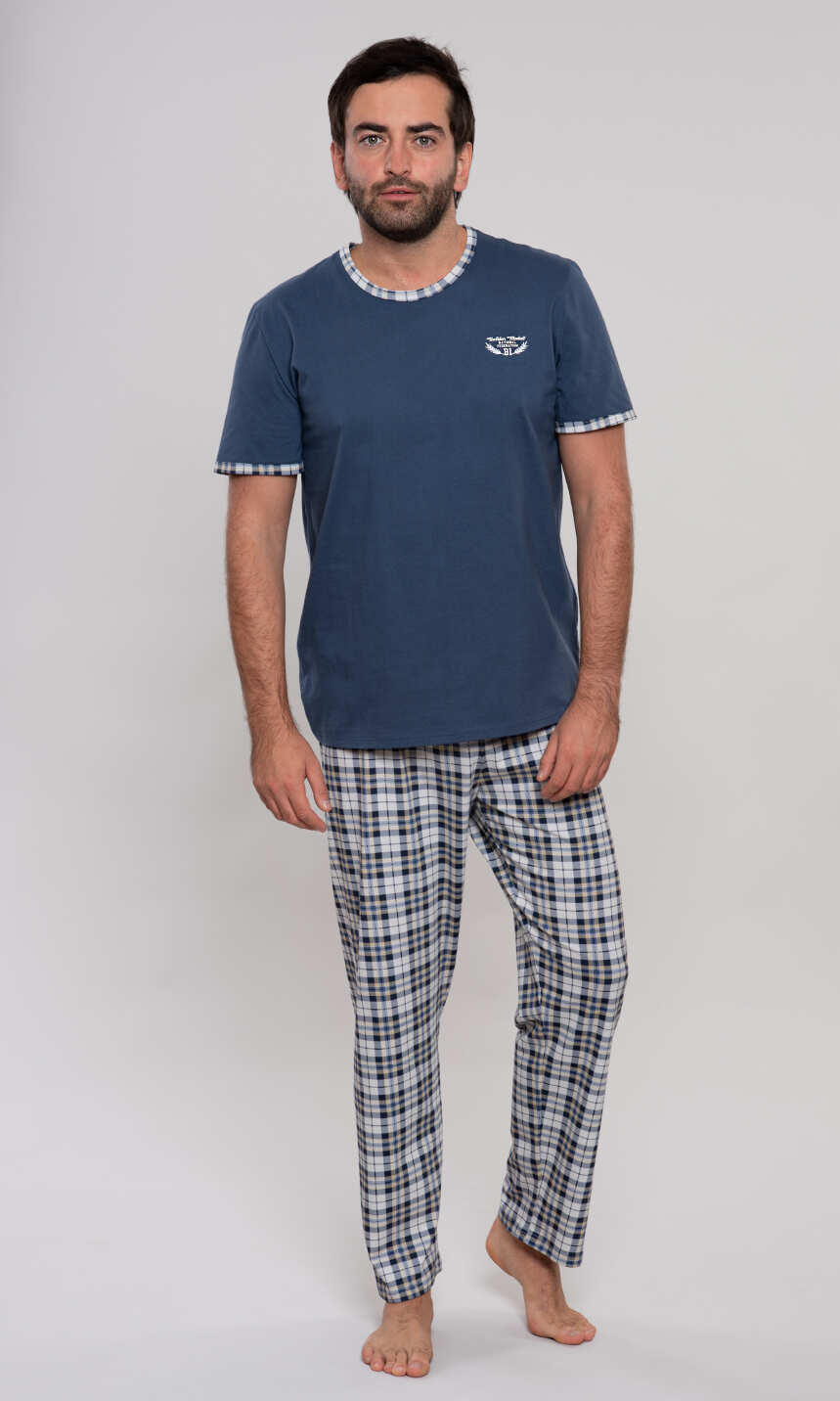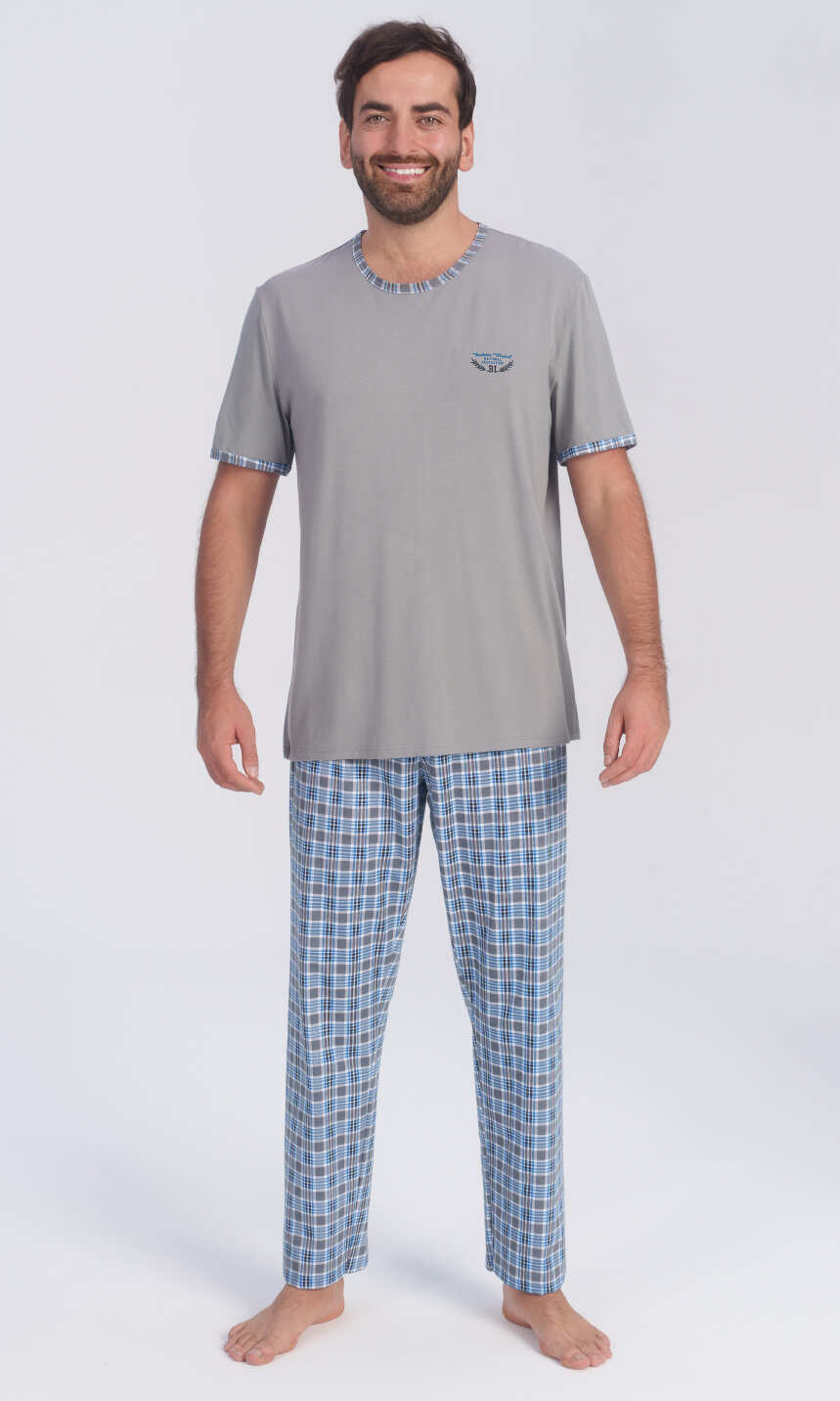 Bluza w formie T-shirtu z dekoltem i rękawami wykończonymi lamówkami z materiału w kratę jak spodnie. Dół bluzy zakończony podwinięciem. Spodnie z nadrukiem w ładnie zestawioną kolorystycznie kratę, z wciągniętą i zaszytą w pasie gumką. Wygodna, miła dla ciała.