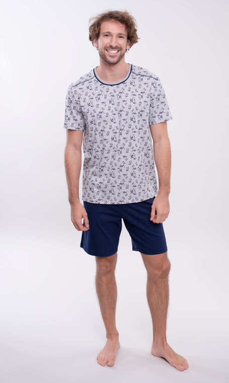 Bluza w kolorze szarego melanżu. Półokrągły dekolt wykończony bawełnianą, ściągaczową lamówką bez nadruku i ozdobiony wąską, granatową wypustką. Na ramionach dekoracyjne, granatowe przeszycia. Rękawy i dół bluzy zakończone podwinięciem. Spodenki gładkie, bez nadruku, całe w granatowym kolorze. W pasie wciągnięta i zaszyta trzycentymetrowa guma. Z bokserkami 20160 może tworzyć bardzo ładny komplet bielizny męskiej.