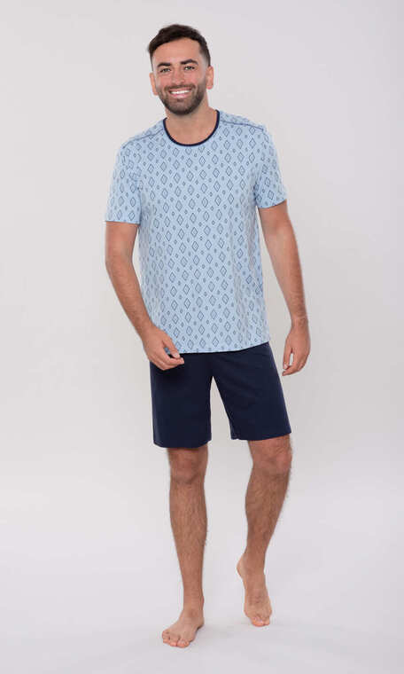 Półokrągły dekolt wykończony jedną szerszą i kontrastową węższą, ściągaczową wypustką. Na ramionach dekoracyjne przeszycia. Rękawy i dół bluzy zakończone podwinięciem. Spodenki gładkie, bez nadruku. W pasie wciągnięta i zaszyta trzycentymetrowa guma. Piżama w kolorze 58 i 339 idealna dla miłośników żeglarskich wypraw, choćby jedynie tych wyśnionych.