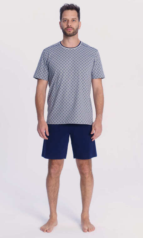 Półokrągły dekolt wykończony jedną szerszą i kontrastową węższą, ściągaczową wypustką. Na ramionach dekoracyjne przeszycia. Rękawy i dół bluzy zakończone podwinięciem. Spodenki gładkie, bez nadruku. W pasie wciągnięta i zaszyta trzycentymetrowa guma. Piżama w kolorze 58 i 339 idealna dla miłośników żeglarskich wypraw, choćby jedynie tych wyśnionych.