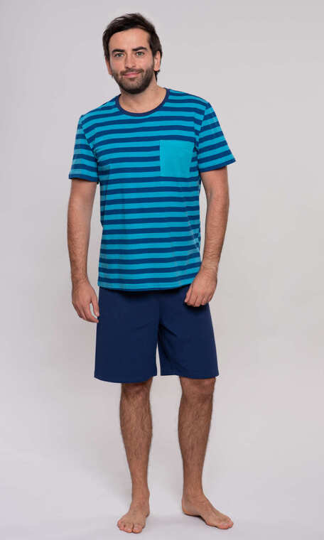 Góra w formie T-shirtu w granatowo-turkusowe paski, z praktyczną kieszonką z lewej strony. Półokrągły dekolt wykończony bawełnianą, ściągaczową, lamówką. Spodnie granatowe, z wciągniętą i przeszytą w pasie trzycentymetrową gumą. Nogawki zakończone podwinięciem. Wygodna i praktyczna.