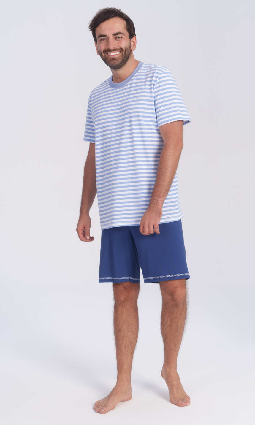 Góra w formie T-shirtu w biało-błękitne paski. Półokrągły dekolt wykończony błękitną, bawełnianą wypustką. Rękaw wszyty klasycznie, z podkrojem. Spodnie w kolorze jasnego granatu, z wciągniętą w materiałowy tunel w pasie i przeszytą czterocentymetrową gumą. Nogawki zakończone podwinięciem, ozdobione dekoracyjnym, białym ściegiem. Wygodna, miła dla ciała i oka.