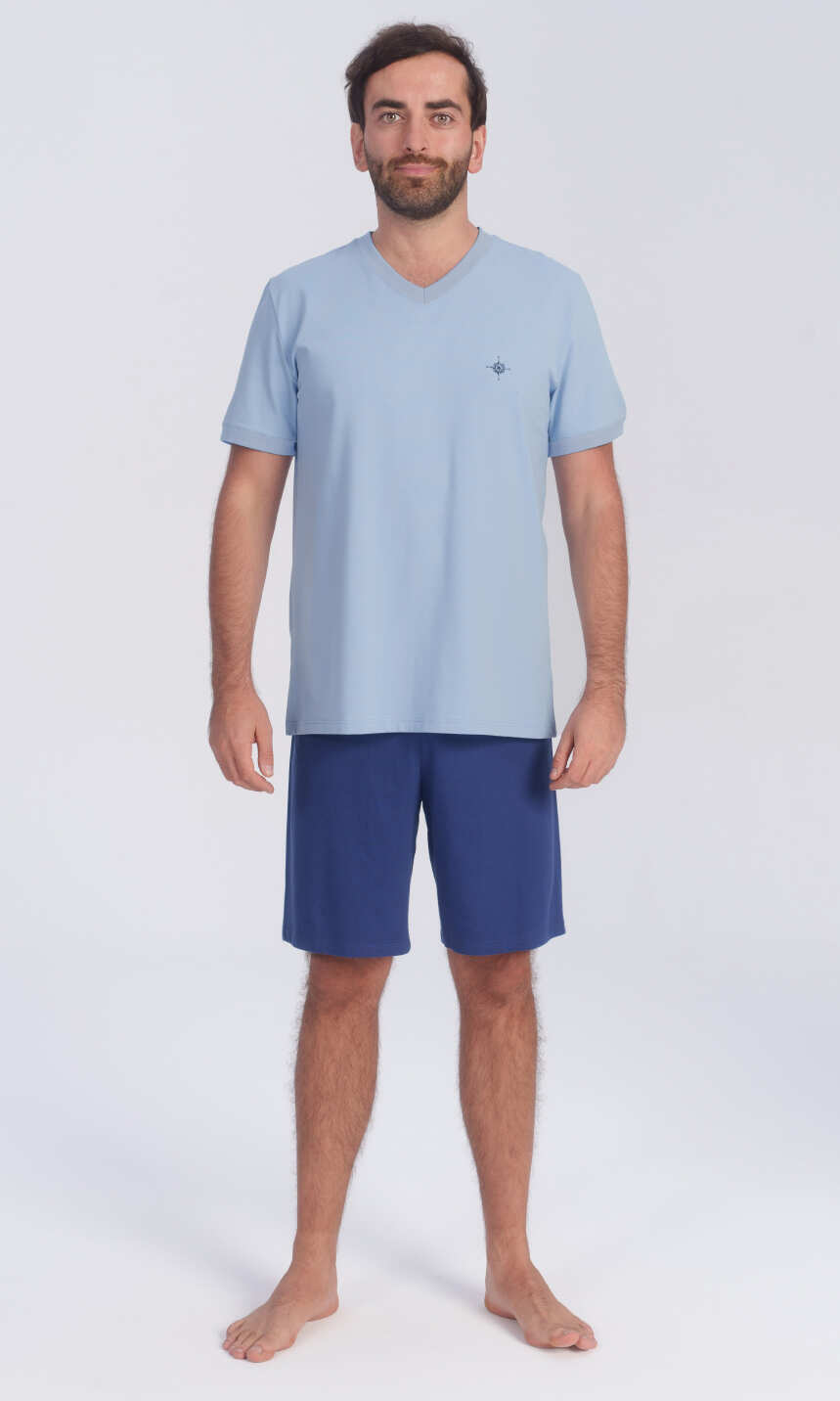Bluza w kolorze lawendowego błękitu. Dekolt w serek, z bawełnianą, szeroką, ściągaczową wypustką. Rękaw wszyty klasycznie, z podkrojem, wykończony ściągaczem jak dekolt. Spodnie krótkie, w kolorze jasnego granatu, z wciągniętą w materiał i zaszytą trzycentymetrową gumą w pasie. Klasyczny model piżamy mający swoich zwolenników.