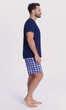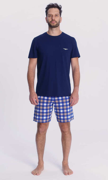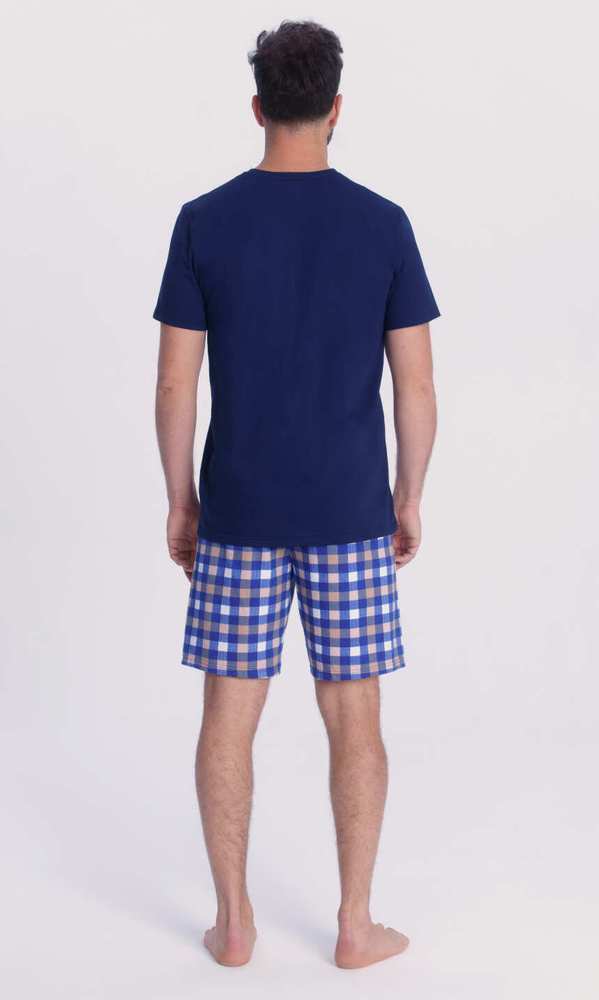 Bluza w formie atramentowego T-shirtu. Półokrągły dekolt wykończony ściągaczową wypustką w tym samym kolorze. Spodenki w kratkę, z wciągniętą i zaszytą w pasie szeroką, trzycentymetrową gumą. Estetyczna, wygodna, miła dla ciała i oka.