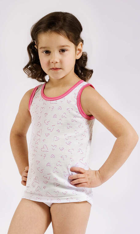Podkoszulek z drobnym, wdzięcznym nadrukiem . Dekolt oraz ramiona wykończone bawełnianą lamówką. Biały podkoszulek może stanowić komplet z figami 40012.