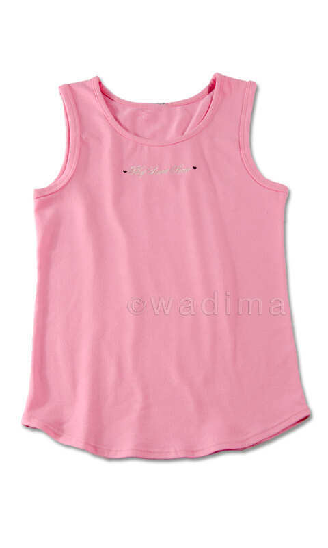 Cały w jednolitym kolorze kremowego różu, na przodzie ze srebrnym napisem "My Sweet Bear", ujętym w dwa malusieńkie, wyhaftowane, czarne serduszka.Dekolt i ramionka wykończone węższą i szerszą bawełnianą lamówką w tym samym kolorze. Dół półokrągły, zakończony podwinięciem. Najwyższa jakość bawełny w połączeniu z elastanem sprawia, że jest lekko sprężysta, mięsista, miła dla ciałka i bardzo trwała. Z Figami 40025 tworzy prawdziwie cukierkowy, dziewczęcy komplecik.
