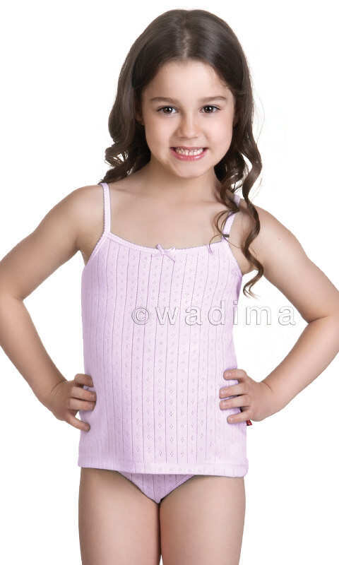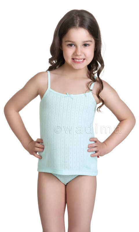 Wykonany z żakardowej, tj. z powtarzającym się wzorem , wysokogatunkowej , bawełnianej dzianiny w prążek. Dekolt i paszki obszyte elastyczną, bawełnianą lamówką, z której wykonane są cienkie ramiączka. Po środku mała, satynowa kokardka. Mięciutki, miły dla ciałka, mięsisty i sprężysty a do tego w cukierkowych wręcz kolorach. Z figami 40022 tworzą ładny, dziewczęcy komplecik.
