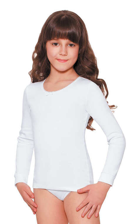 Dekolt bardzo ładnie wykończony cieniutką, ozdobną gumeczką, dzięki czemu nie ma problemu z zakładaniem. Z przodu mała, dekoracyjna, satynowa kokardka. Rękawy wykończone szerokim mankietem. Dzianina ściągaczowa idealnie przylega do ciałka, nie krępując przy tym ruchów, dlatego bardzo wygodny w użytkowaniu.