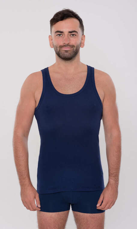Klasyczny męski podkoszulek na szerokich ramiączkach. Wykonany z najwyższej jakości czysto-bawełnianej dzianiny ściągaczowej w prążek. Miękki, przyjemny dla ciała.