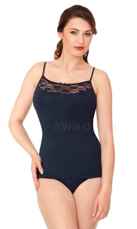Ramiączka wykonane z bardzo sprężystej gumo-lamówki, dzięki czemu ładnie dopasowują się do ciała i się nie zsuwają. Przód bardzo dekoracyjny, z elastyczną, koronkową wstawką z przodu i małą, satynową kokardką po środku. Dół podkoszulka zakończony podwinięciem. Zaliczany do bielizny z "górnej półki" - eleganckiej i szykownej. Z figami 100144 i 100145 tworzą bardzo ładny , bieliźniany komplet damski.