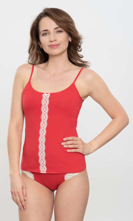 Prosta forma z naszytym pionowo pasem koronki na przodzie. Wykonany z połączenia delikatnej wiskozy i niewielkiej ilości nadającego dzianinie sprężystości elastanu. Miękki, delikatny, sprężysty, wygodny w użytkowaniu i miły dla ciała.