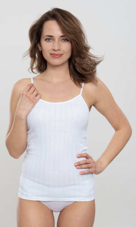 Wykonany z żakardowej, tj. z powtarzającym się wzorem, wysokogatunkowej, czysto-bawełnianej, ściągaczowej dzianiny. Dekolt i paszki obszyte elastyczną, bawełnianą lamówką, z której wykonane są wąskie ramiączka. Dół zakończony podwinięciem. Podkoszulek bardzo miękki i miły dla ciała.