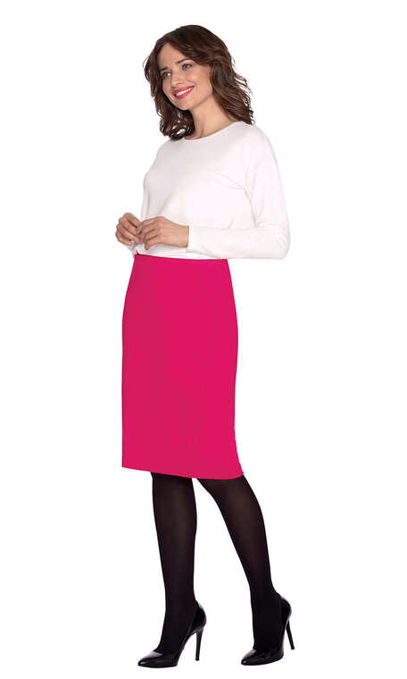 Fason prosty z bocznymi pionowymi cięciami (szwami) na przodzie  i ukośnymi na górze, wyszczuplającymi optycznie sylwetkę. Dzianina  mocna i sprężysta.