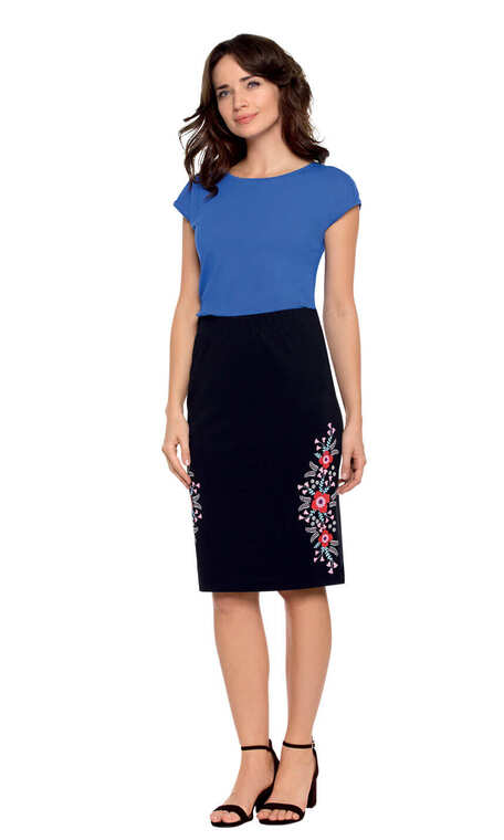 Fason prosty, bez rozporków. Na przodzie po obu stronach kolorowy, optycznie zwężający fason spódnicy i wysmuklający sylwetkę sitodruk z ludowym wzorem w kwiaty. Dół elegancko wykończony techniką bezszwową. Wygodna i praktyczna.