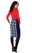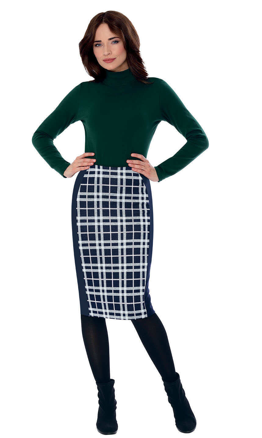 Elegancka, w kratę, a dzięki gładkim, granatowym wstawkom po bokach, optycznie niewiarygodnie wyszczuplająca. Wykonana z żakardowej dzianiny powstałej z połączenia  wiskozy, niewielkiej ilości poliesteru i nadającego dzianinie sprężystości elastanu.
