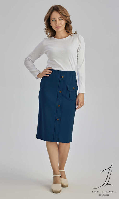 W pasie wciągnięta w material guma o szerokości 3,5 cm. Pośrodku przodu naszyta z tego samego materiału pionowa listwa, z czterema ładnie dopasowanymi guzikami. Z lewej strony, na przodzie kieszonka z klapką. Tył gładki, ze szwem pośrodku i porządnie wykończonym rozporkiem na dole. Dół z dwuipółcentymetrowym podwinięciem. Z bluzką 1N370 może tworzyć bardzo efektowny, wygodny, sportowy komplet damski.