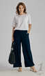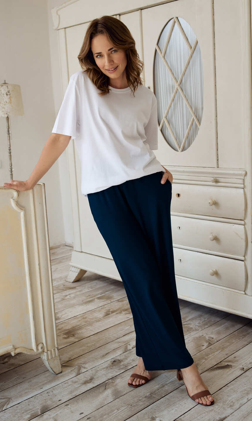 Modne, z szerokimi, wygodnymi nogawkami. Wykonane z połączenia delikatnej wiskozy z nadającym dzianinie sprężystości elastanem.