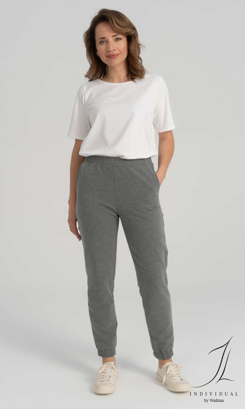 W pasie wciągnięta w tunel i przeszyta czterocentymetrowa guma. Po bokach praktyczne kieszenie. Nogawki minimalnie zwężane ku dołowi, z wciągniętą w materiałowy tunel trzycentymetrową gumą na końcu. Miłe dla ciała, praktyczne i bardzo wygodne w użytkowaniu.