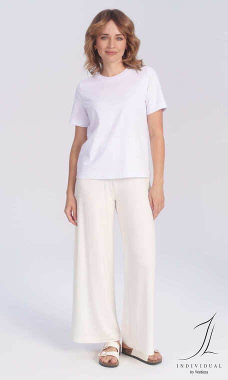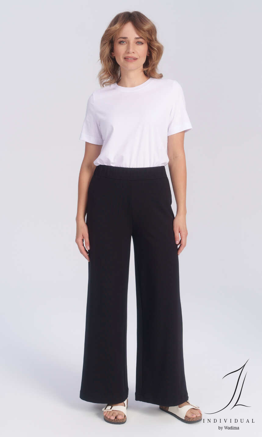 Modne, z szerokimi, wygodnymi nogawkami. Wykonane z połączenia naturalnej wiskozy z nadającym dzianinie sprężystości elastanem.