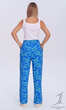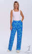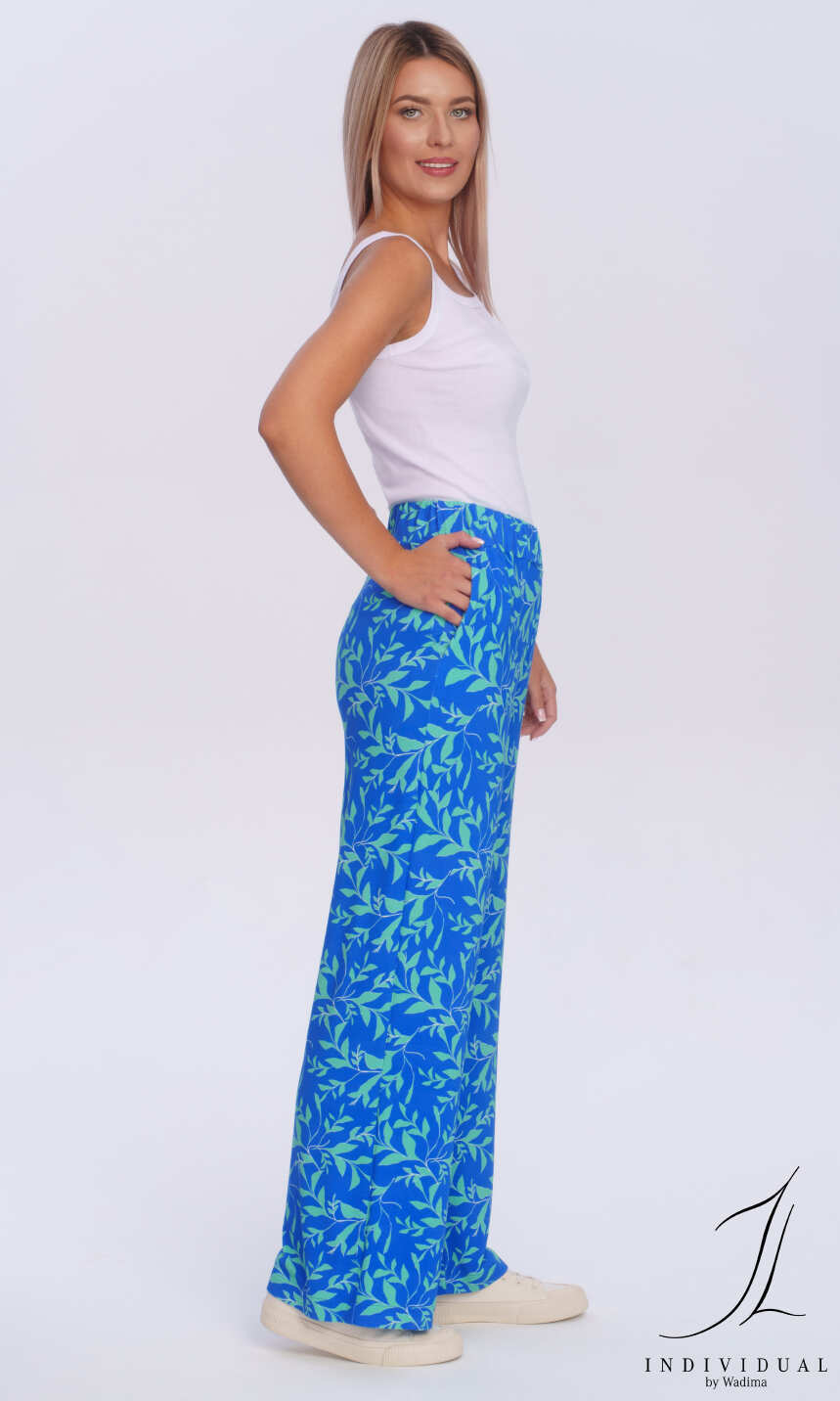 Z prostymi, szerokimi nogawkami i roślinnym nadrukuiem na niebiesko-bławatkowym tle. Wykonane z połączenia delikatnej, chłodzącej latem wiskozy z niewielką ilością nadającego dzianinie sprężystości elastanu.