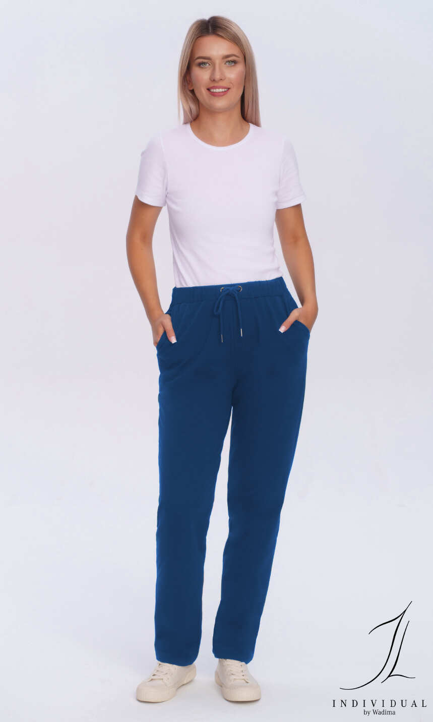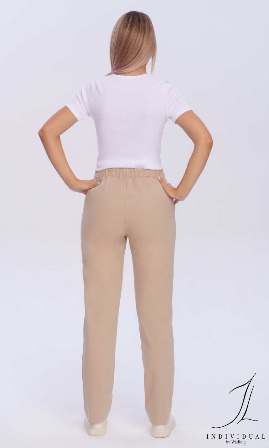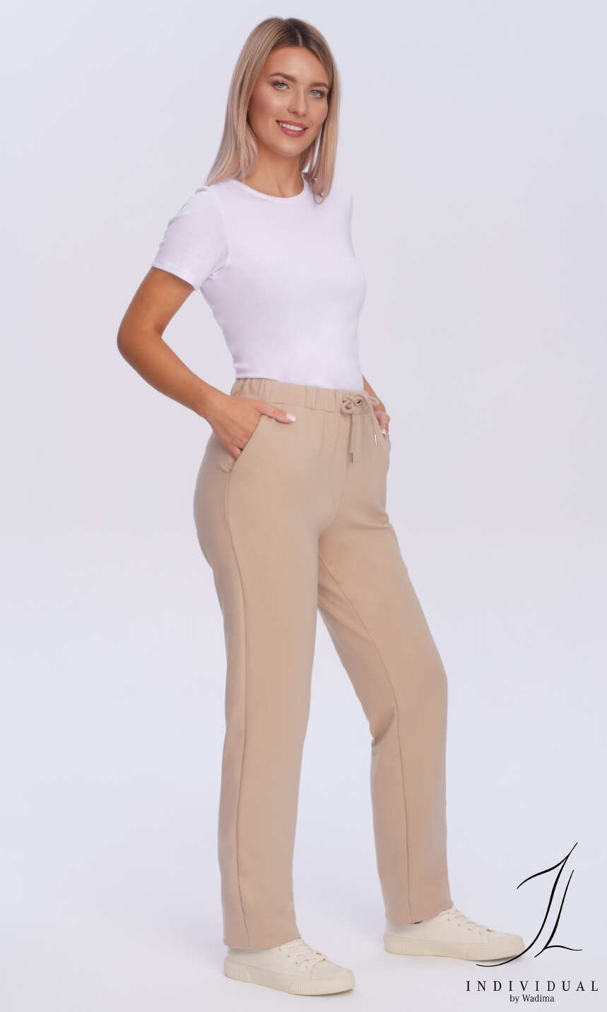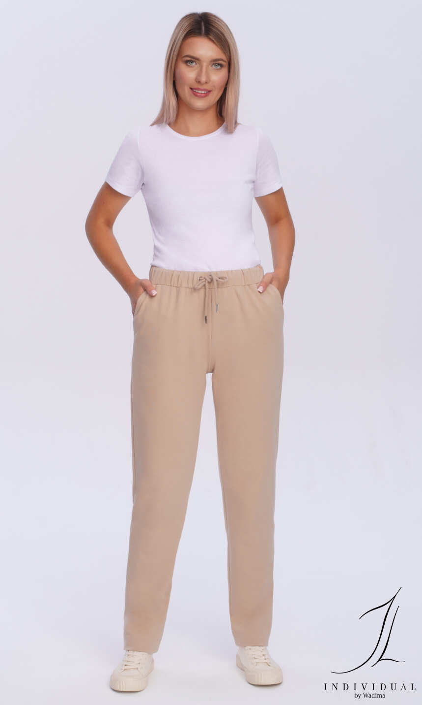 Pas z wciągniętą w bawełniany, czterocentymetrowy tunel gumą oraz przeciągniętym  troczkiem do ewentualnego ściągnięcia. Po bokach wygodne kieszenie.  Nogawki minimalnie zwężane ku dołowi, zakończone podwinięciem. Rewelacyjne do ćwiczeń, biegania jak i na co dzień do zwykłych zajęć domowych.