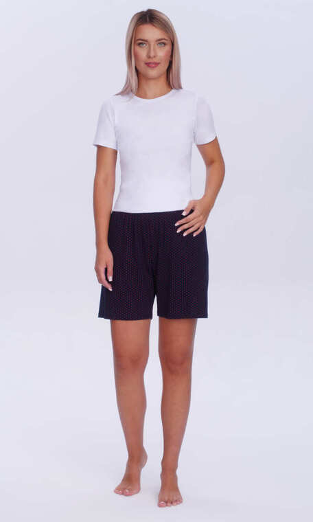 Całe w kolorze głębokiego granatu z subtelnymi, czerwonymi kropkami. Wykonane z połączenia delikatnej, miękkiej wiskozy modal i przyjemnej dla ciała bawełny.