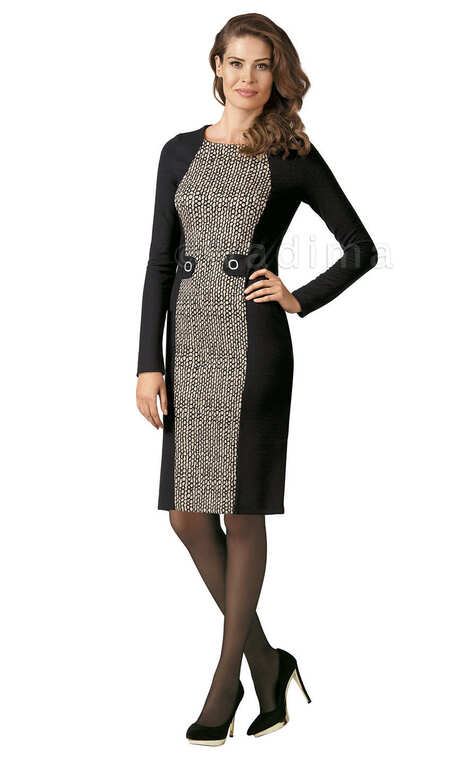 Niewielki dekolt ładnie wykończony plisą od wewnętrznej strony. Na przodzie, po środku przez całą długość, żakardowa wstawka z wzorem przypominającym plaster miodu, która optycznie wyszczupla sylwetkę i nadaje jej kobiecych kształtów. W pasie, z obu boków wszyte dekoracyjne klapki z guzikami podkreślające talię. Tył sukienki czarny, gładki, z czanym delikatnym suwakiem do pasa i niewielkim rozporkiem na dole. Kobieca, oryginalna, elegancka.