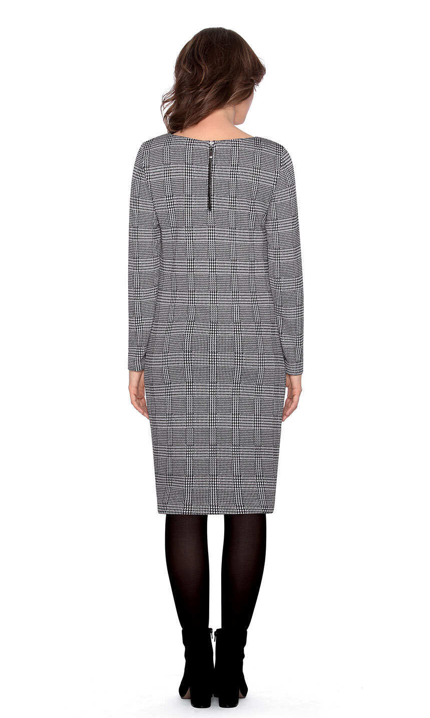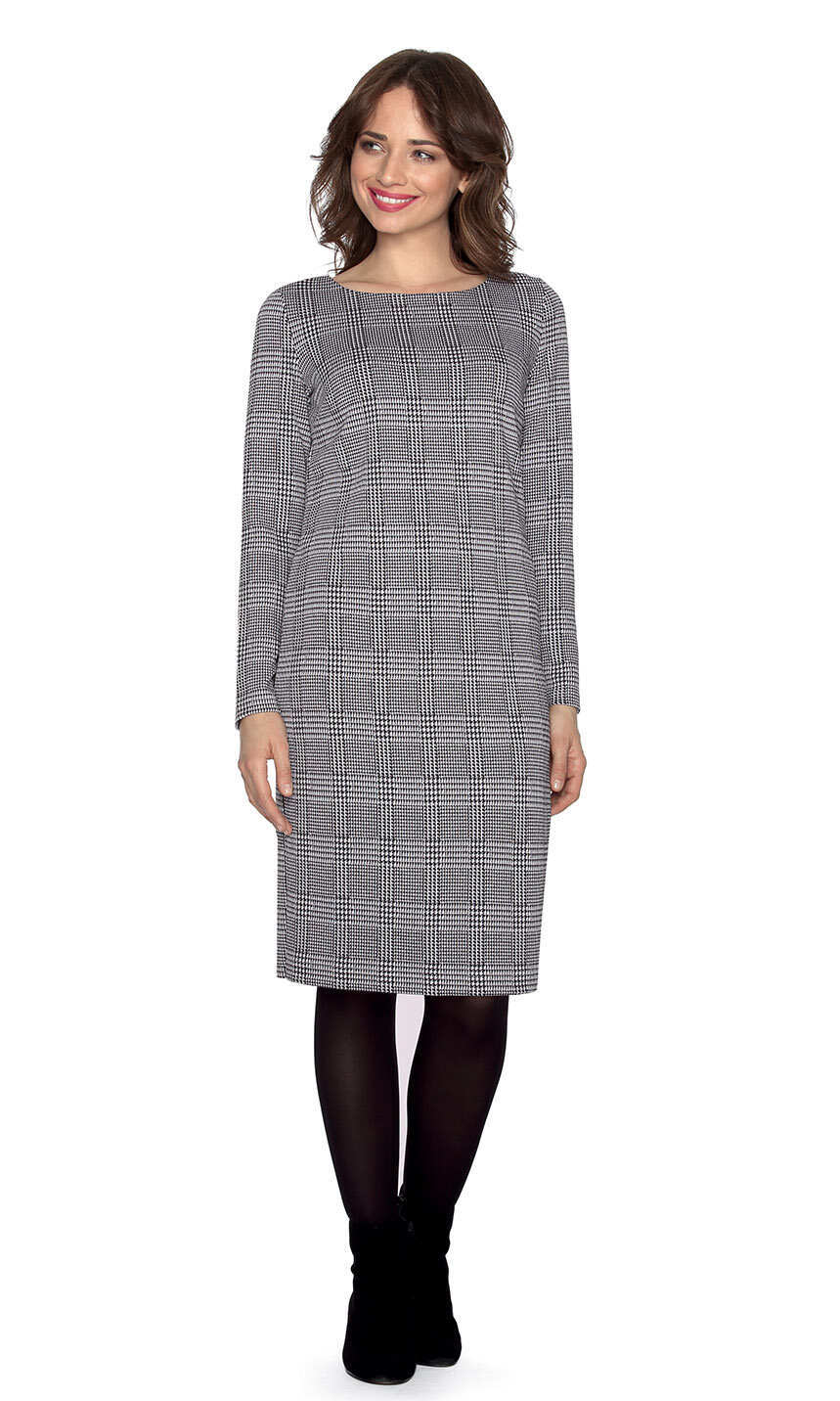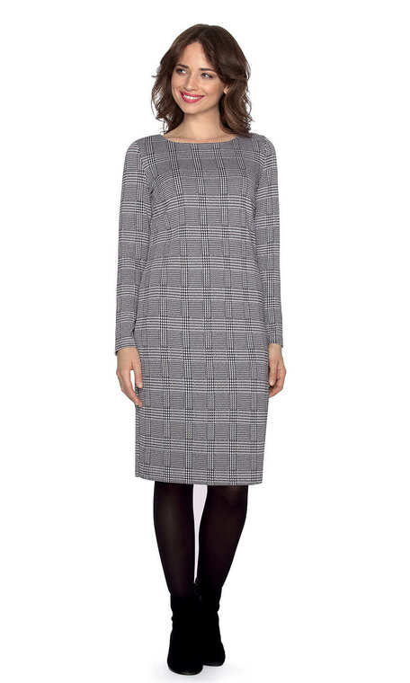 Prosta, klasyczna; wykonana z żakardowej dziany w biało czarną kratę.