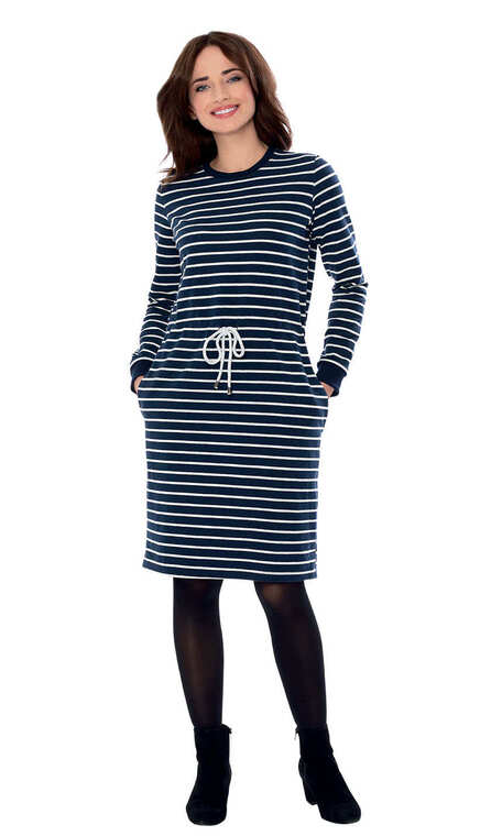 Półokrągły dekolt wykończony wąską, granatową, ściągaczową wypustką. Rękawy wszyte klasycznie, zakończone ściągaczowym mankietem. Lekko poniżej pasa tunel z wciągniętym troczkiem do ewentualnego ściągniecia i zbluzowania. Po bokach wygodne kieszenie. Dół wykończony podwinięciem. Miękka, miła dla ciała, wygodna i praktyczna.