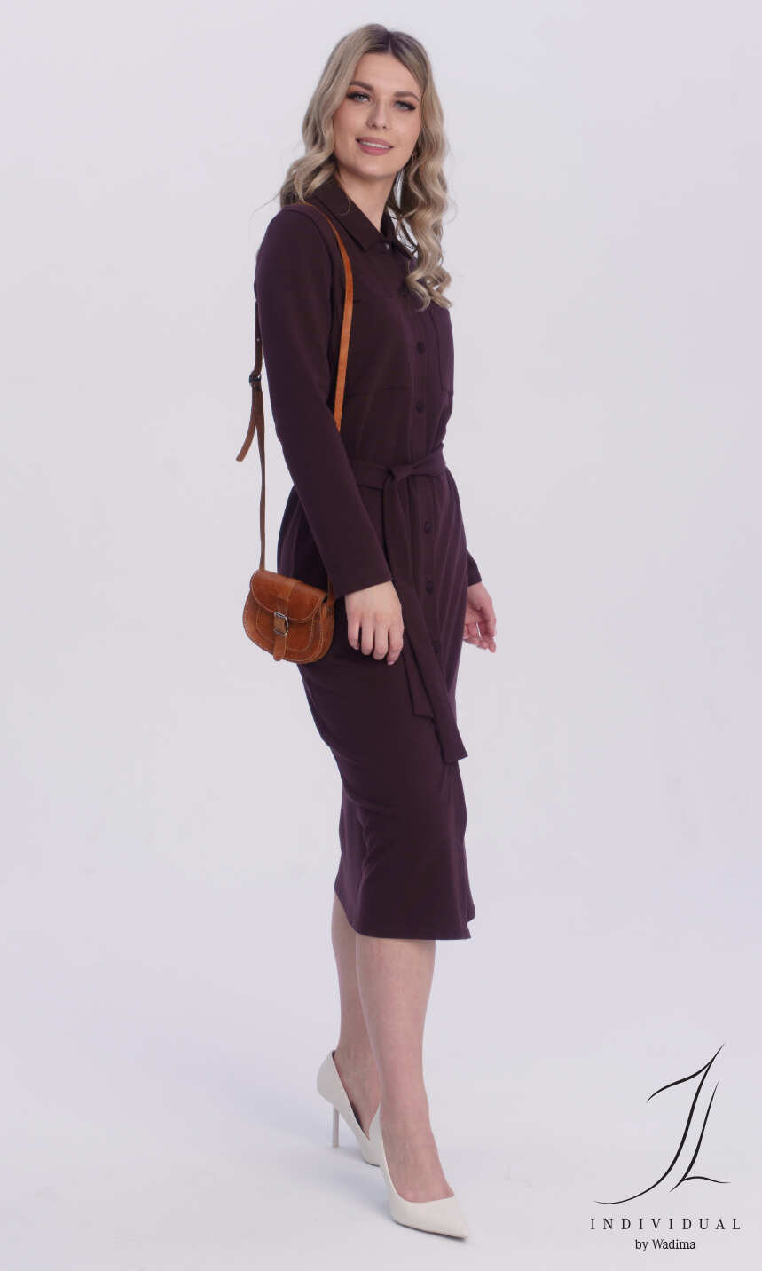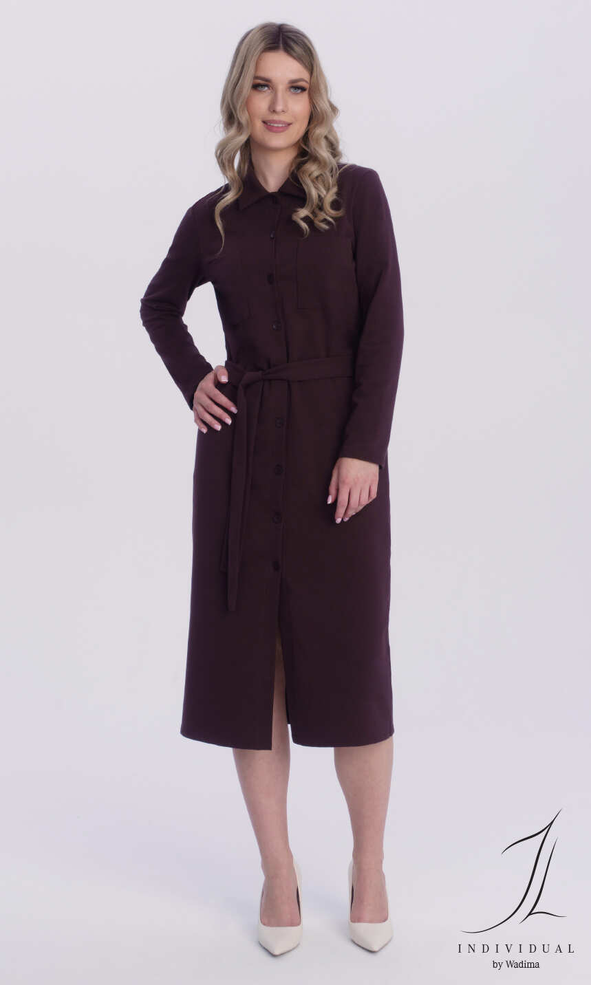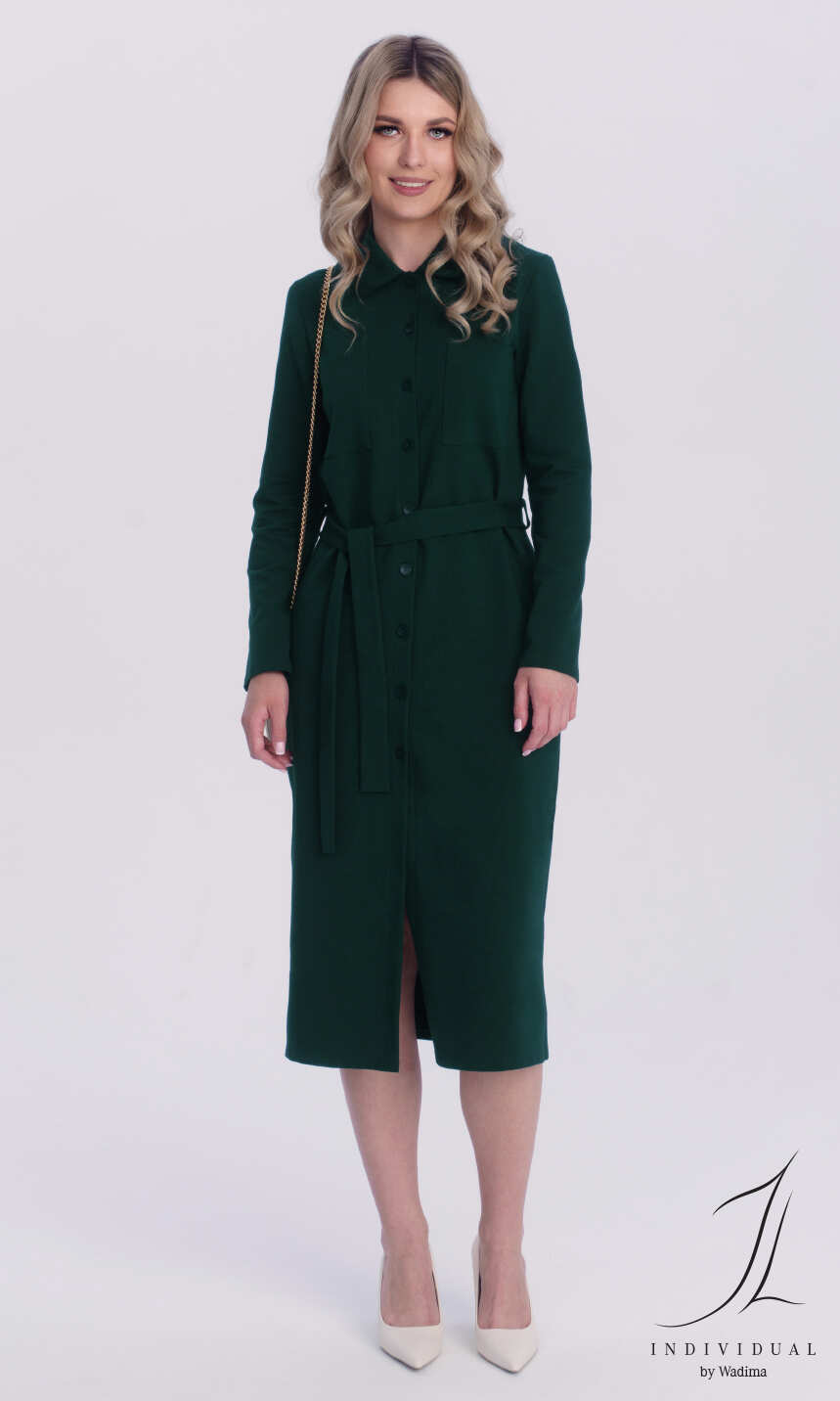 Dekolt w formie kołnierzyka z tego samego materiału. Na przodzie, po jednej z każdego boku naszyte kieszonki. Przez całą długość sukienki rozcięcie zapinane na dziesięć ładnie dopasowanych kolorystycznie guzików. Rękaw klasyczny, z podkrojem, zakończony podwinięciem. W pasie, z każdego boku wąska szlufka i materiałowy pasek do wywiązania. Bardzo wygodna w użytkowaniu, miękka, miła dla ciała.