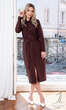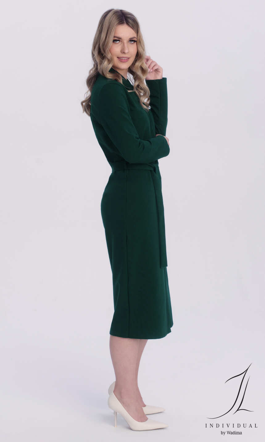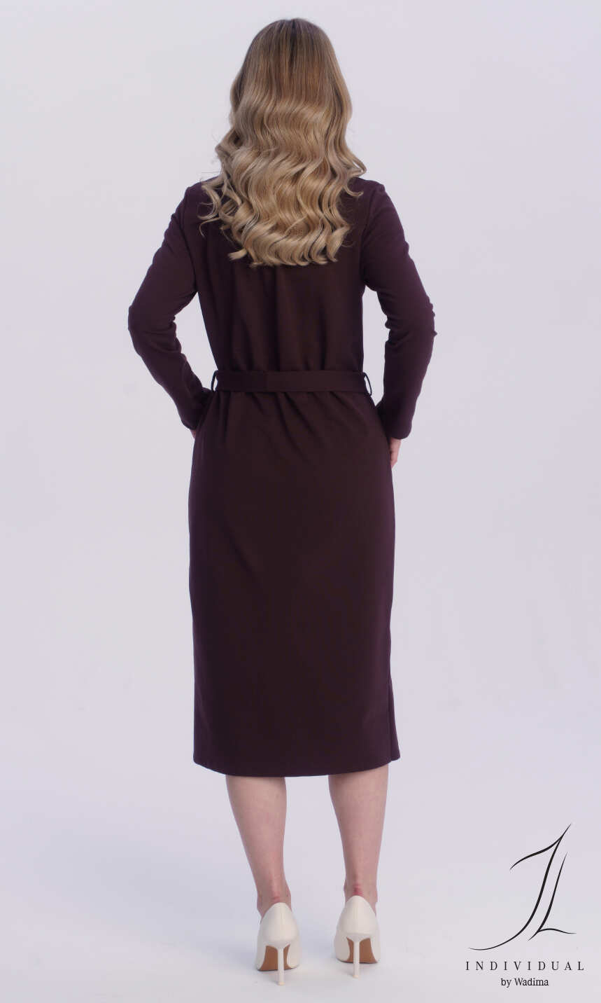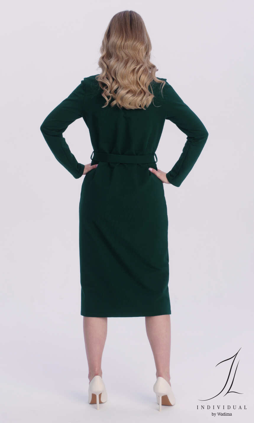 Dekolt w formie kołnierzyka z tego samego materiału. Na przodzie, po jednej z każdego boku naszyte kieszonki. Przez całą długość sukienki rozcięcie zapinane na dziesięć ładnie dopasowanych kolorystycznie guzików. Rękaw klasyczny, z podkrojem, zakończony podwinięciem. W pasie, z każdego boku wąska szlufka i materiałowy pasek do wywiązania. Bardzo wygodna w użytkowaniu, miękka, miła dla ciała.