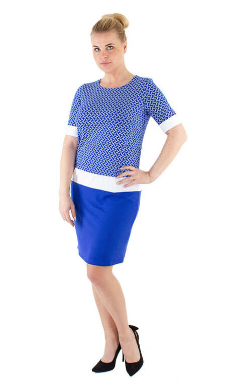 Dekolt półokrągły, ładnie wykończony. Rękawki, dłuższe, do łokcia, zakończone szerokim mankietem, nawiązującym do pasu łączącego górną część sukienki z wzorkiem z czarną częścią dolną. Dół zakończony podwinięciem.