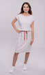 Luźna, wygodna forma. Półokrągły dekolt bardzo ładnie wykończony tzw. wywiniętą pod spód lamówką. Rękaw w formie szerokiego, opadającego ramienia. W pasie wciągnięta w cienki tunel gumka. Po bokach niewielkie szlufki do przeciągnięcia czerwonego paseczka w formie materiałowego , podwójnego troczka. Dół, tak jak i rękawki, zakończony podwinięciem. Miła zarówno dla ciała jak i oka. Idealna na lato.