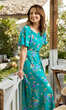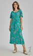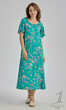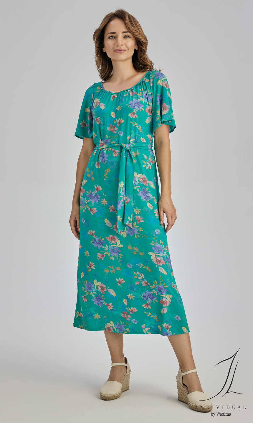 Cała z ładnie zestawionym kolorystycznie, autorskim wzorem w kwiaty na zielono-miętowym tle. Fason rozszerzany ku dołowi. Półokrągły dekolt lekko umarszczony, wykończony wąską lamówką z tej samej dzianiny. Rękaw w formie tzw. motylka, zakończony podwinięciem. Do wywiązania pasek z tego samego materiału. Wygodna, miła dla ciała, a jakość cieniutkiej, chłodzącej dzianiny z jakiej została wykonana, jest niewątpliwie najwiąkszym jej atutem.