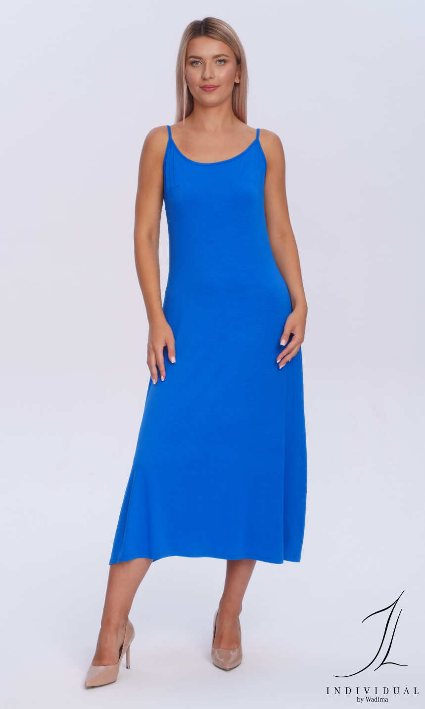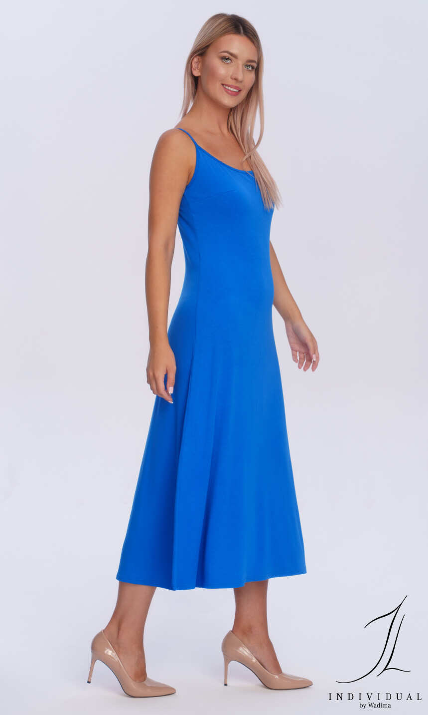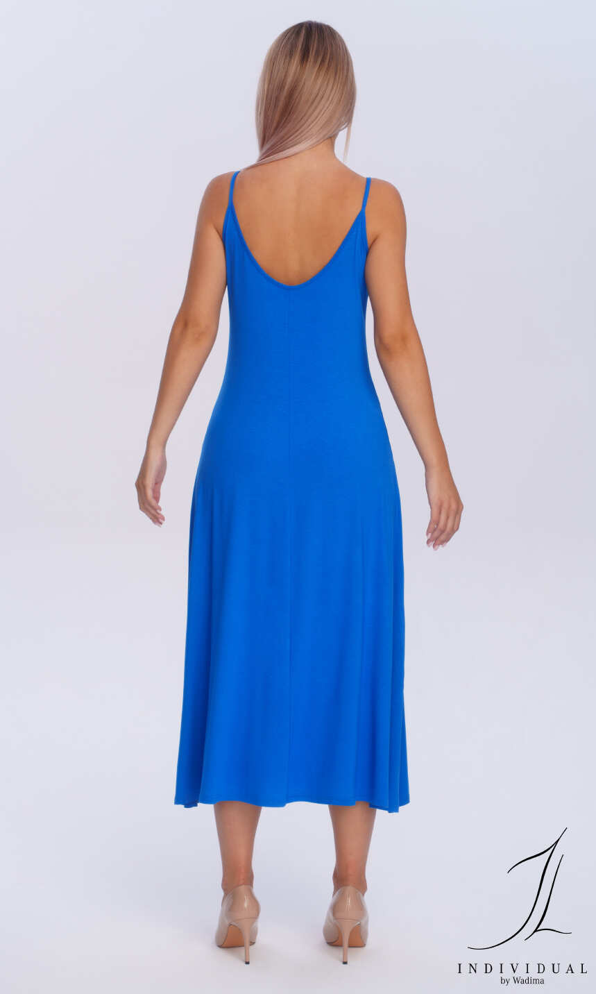 Przedni i głębszy tylny dekolt wykończony wąską lamówką z tego samego materiału, przechodzącą w wąskie ramiączko. Od pasa lekko rozszerzana ku dołowi. Idealna na upalne lato.