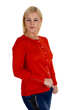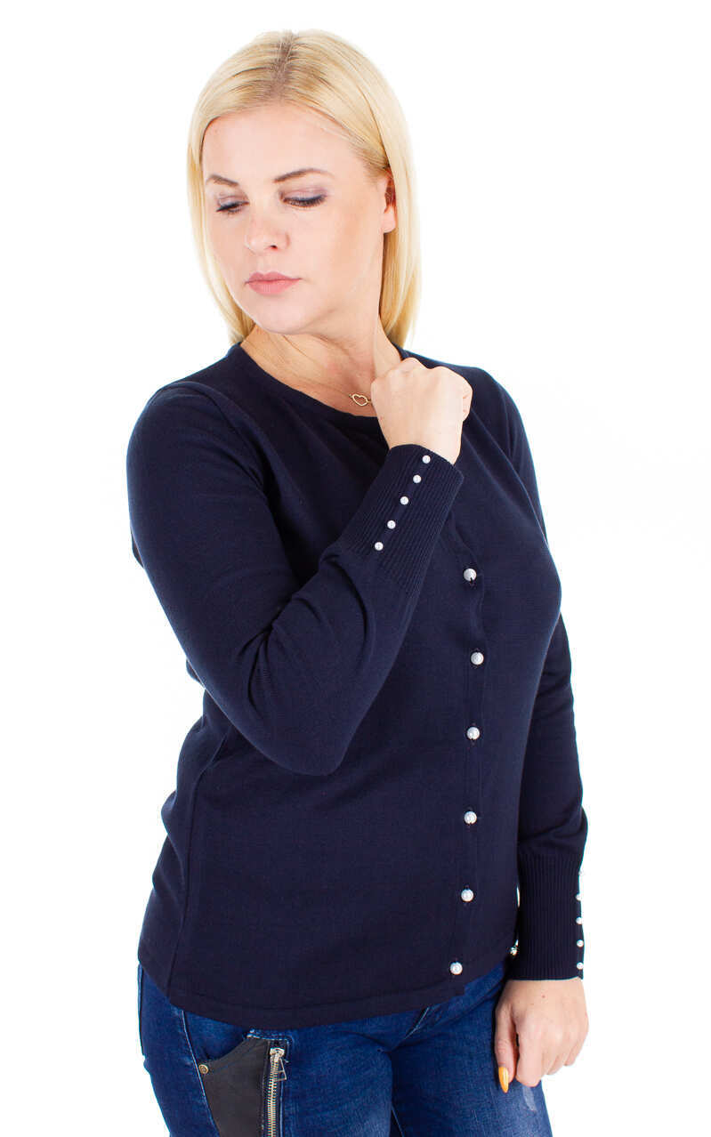 Krój klasyczny. Dekolt mało wykrojony, półokrągły, ładnie wykończony lamówką z tej samej dzianiny. Rękaw klasyczny, wąski, na końcach bardzo ładnie wykończony długim ściągaczowym ściegiem i udekorowany pięcioma malutkimi perełkami w jednym rzędzie . Do wykorzystania w wielu stylizacjach. Dobrze prezentuje się zarówno z elegancką spódniczką jak i zwykłymi spodniami.
