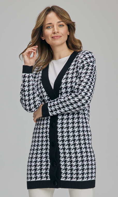 Gruby, ciepły, z modnym, nieustająco szykownym i eleganckim wzorem w biało-czarną pepitkę, nazywaną inaczej "psim zębem" lub "kurzą stopką". Wykonany z połączenia ciepłej wełny i miękkiego, miłego w dotyku akrylu.