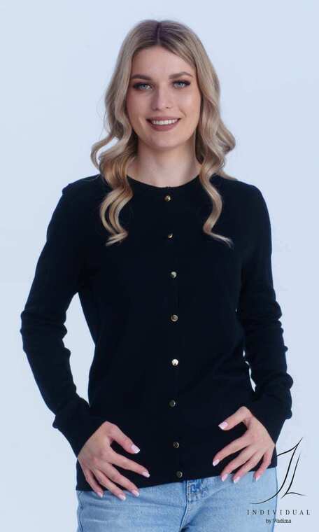 Klasyczny model zapinany na guziki, z półokrągłym dekoltem. Wykonany ze średniej grubości dzianiny, z połączenia bawełny i akrylu po połowie. Miękki, miły dla ciała.