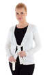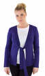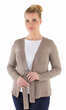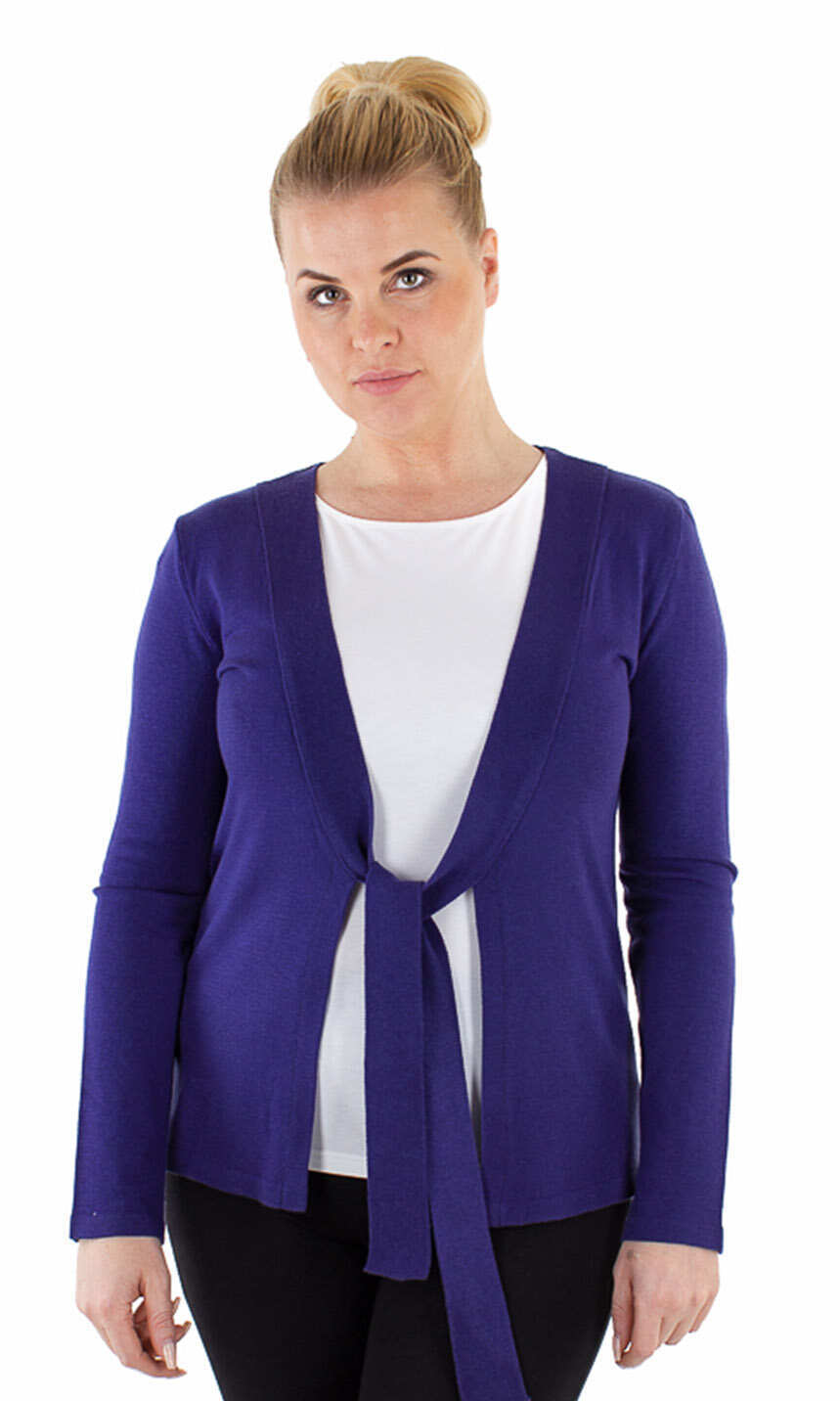Cały w jednolitym kolorze, gładki, bez wzorów. Dekolt wykończony dzianinowym szerokim pasem w tym samym kolorze, schodzącym do pasa, przechodzącym w troczki do zawiązania. Rękawy i dół swetra ładnie wykończone nieco grubszym ściegiem. Idealny jako narzutka na letnią bluzeczkę.