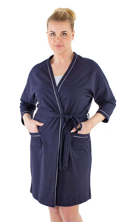 Cały gładki, w jednolitym kolorze, z wszytą przy wykończeniowych lamówkach ozdobną, kontrastującą, wąziutką tasiemką. Rękaw 3/4, wygodny w użyciu, po bokach praktyczne kieszonki. Pasek przeciągnięty przez boczne szlufki. Z koszulą nocną 104326 lub piżamą damską 104325 tworzą bardzo ładny komplet bielizny damskiej.