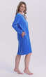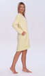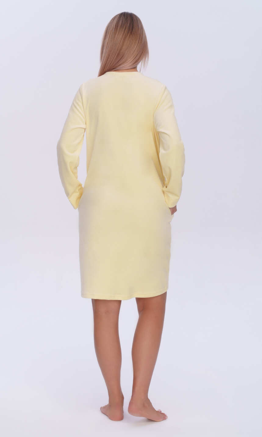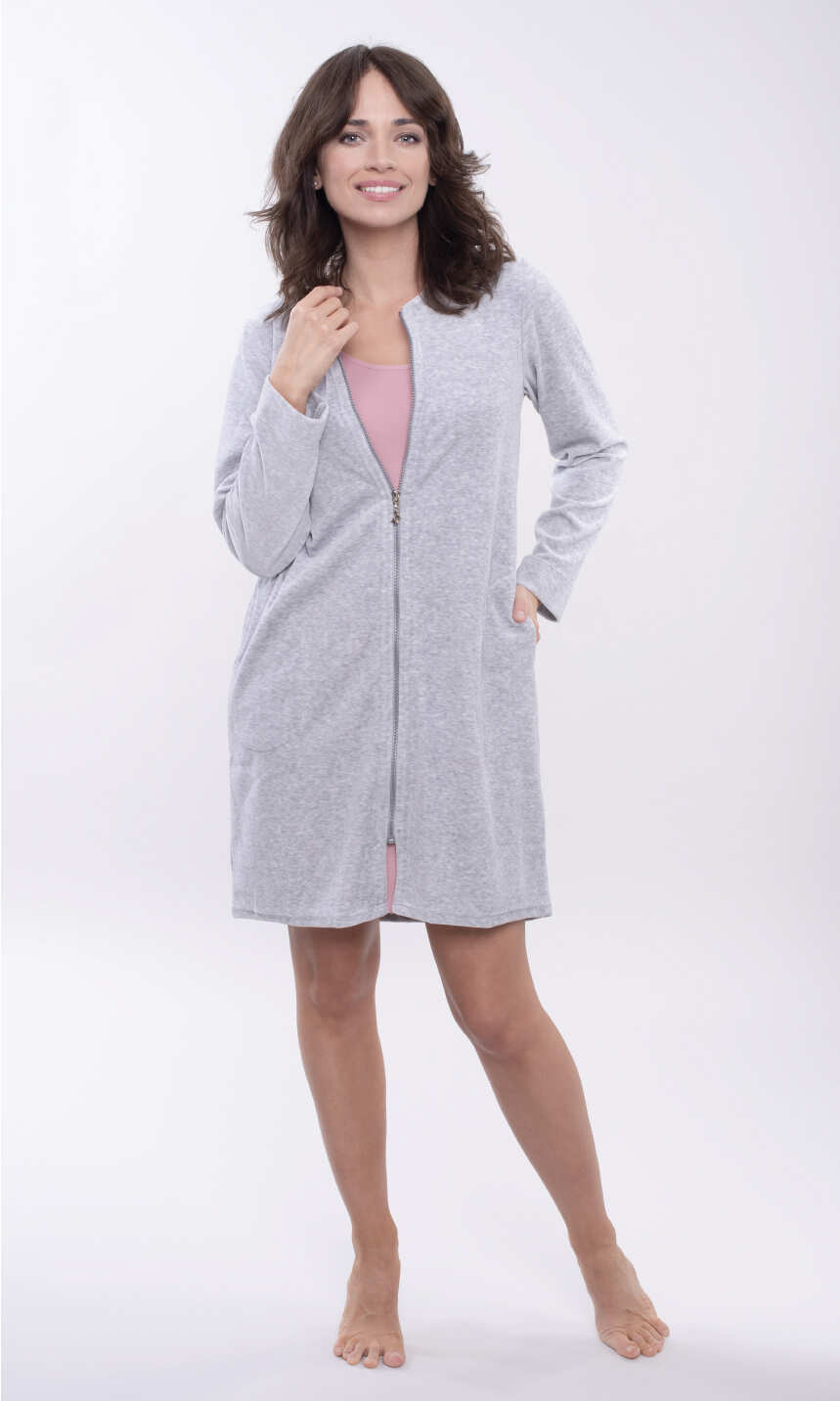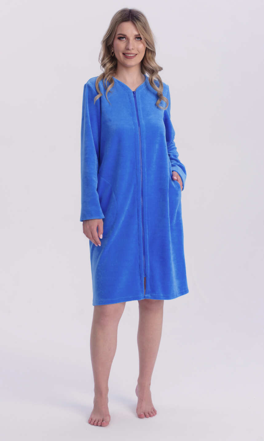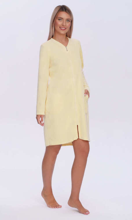 Dekolt mało wykrojony, ładnie wykończony podwinięciem. Z przodu, przez prawie całą długość zapięcie na suwak. Po bokach praktyczne kieszenie. Z tyłu, przy szyi od środka, wygodny wieszak. Miły dla ciała i wygodny w użytkowaniu.