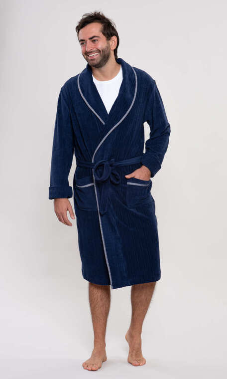 Wykonany z dzianiny typu frote, w prążki. Krój klasyczny z szalowym kołnierzem.