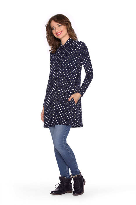 Dekolt wykończony kołnierzykiem z tego samego materiału. Zapinana na osiem granatowych guziczków przez całą długość tuniki. Rękaw klasycznie skrojony, zakończony jak dół podwinięciem. Forma rozszerzana ku dołowi. Na bocznych szwach praktyczne kieszenie. Idealna do eleganckich spodni, leginsów czy zwykłych wytartych dżinsów.