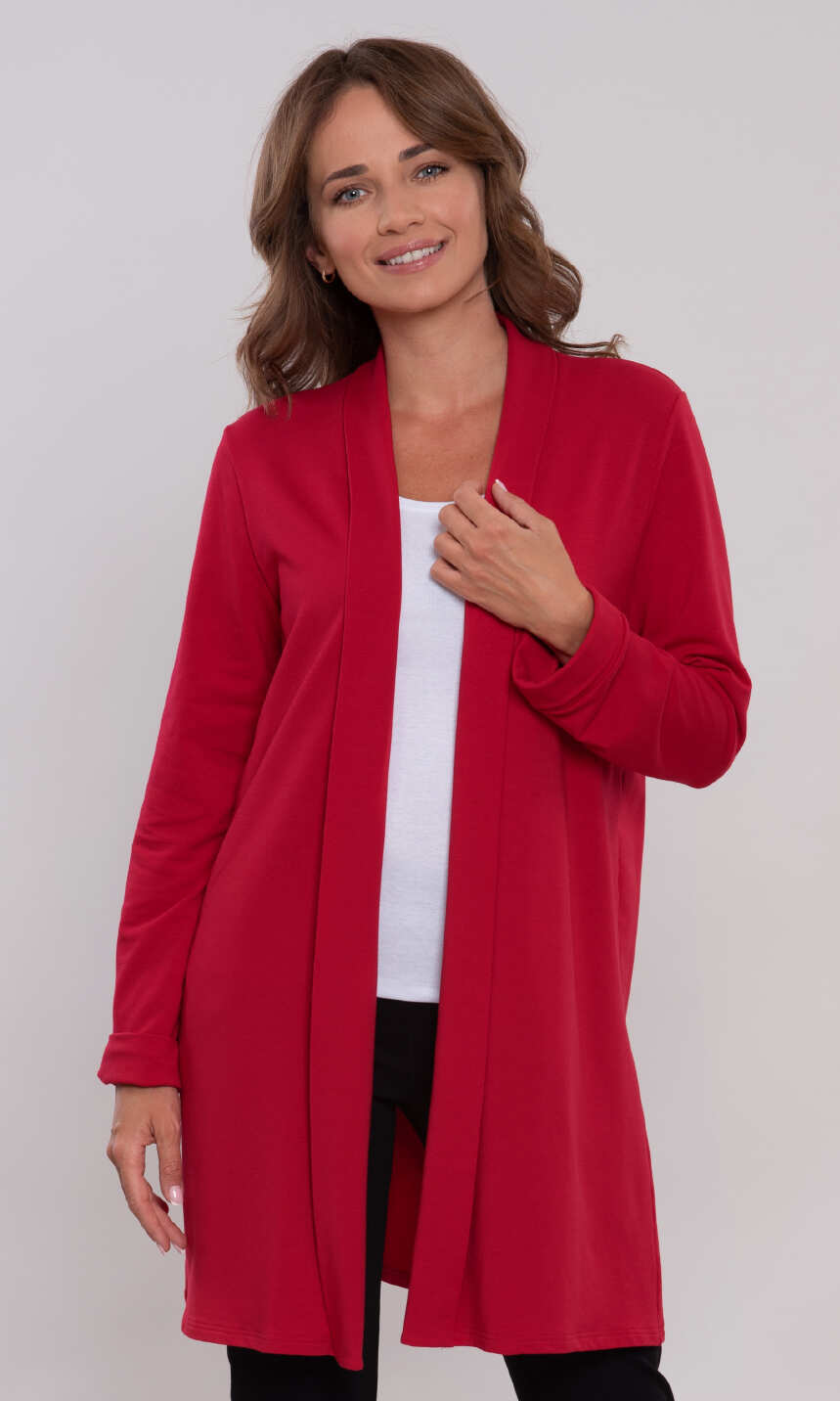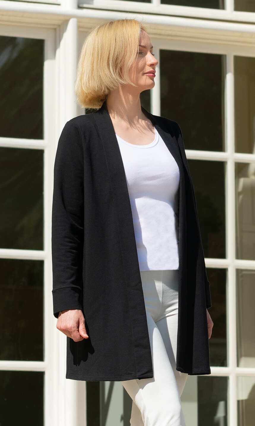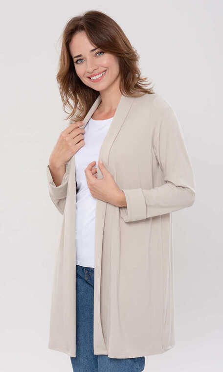 Z szalowym, eleganckim wykończeniem. Wykonane z połączenia delikatnej, uszlachetnionej tzw. wiskozy modal, wysokiej jakości bawełny i niewielkiej ilości nadającego dzianinie sprężystości elastanu. Miękkie, przyjemne dla ciała.