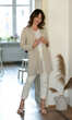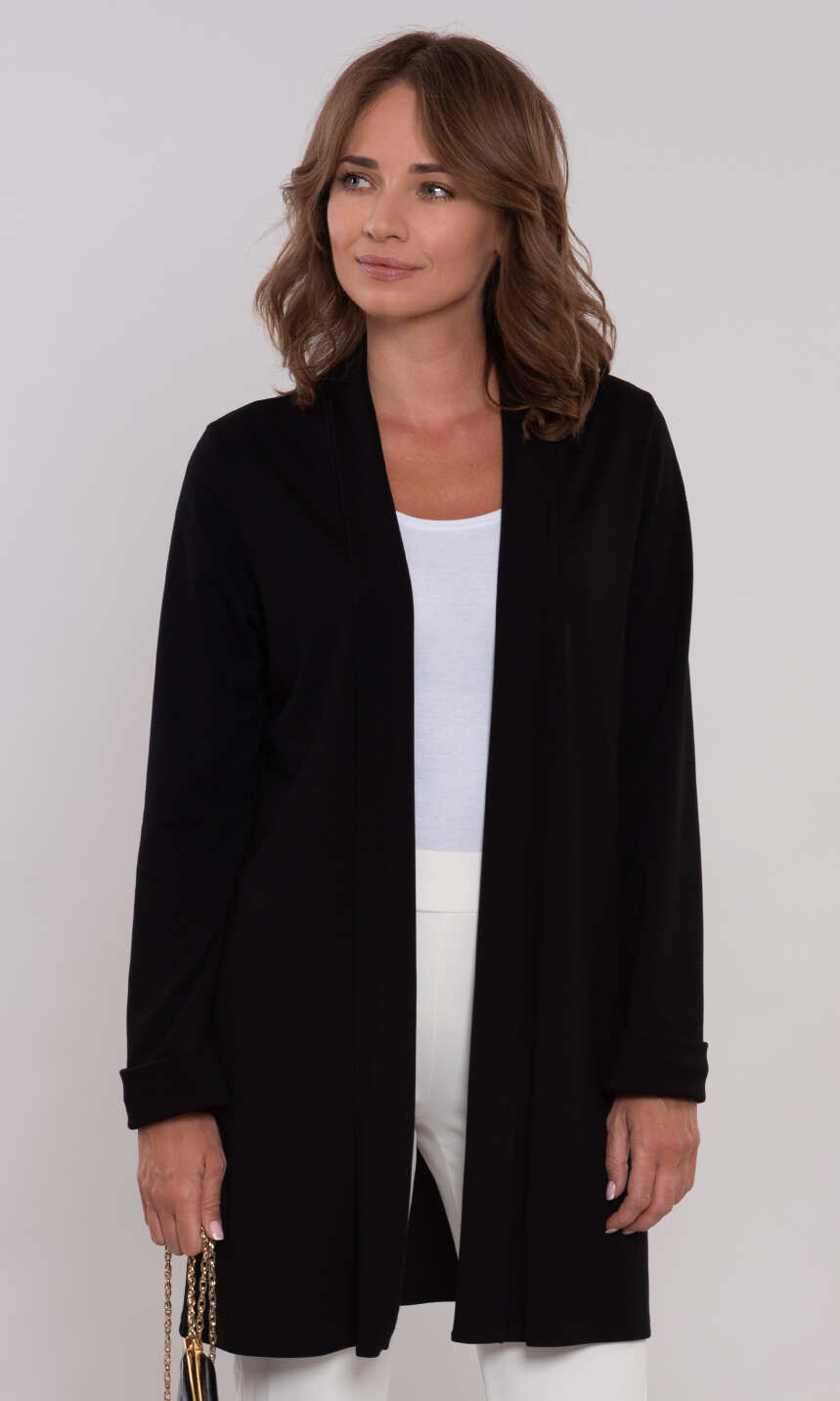 Fason minimalnie rozszerzany ku dołowi. Rękaw wszyty klasycznie, z szerokim mankietem. Dół zakończony podwinięciem. Do wykorzystania w różnych stylizacjach.